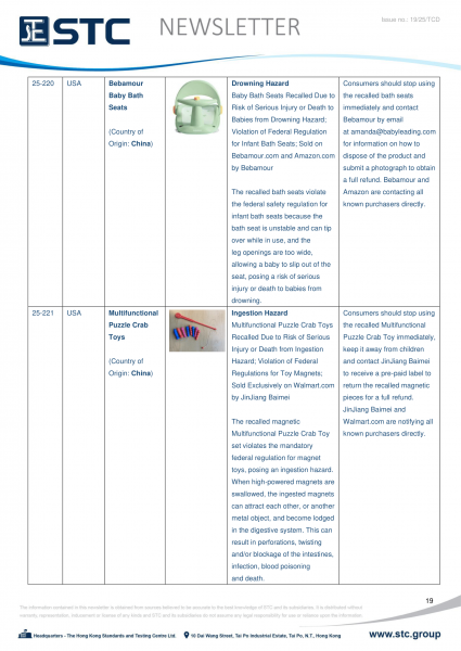 The official contact points of the Member and EFTA-EEA States provide the information published in these weekly overviews. Under the terms of Annex II.10 of the General Product Safety Directive (2001/95/EC) responsibility for the information provided lies with the notifying party. The Commission does not take any responsibility for the accuracy of the information provided.