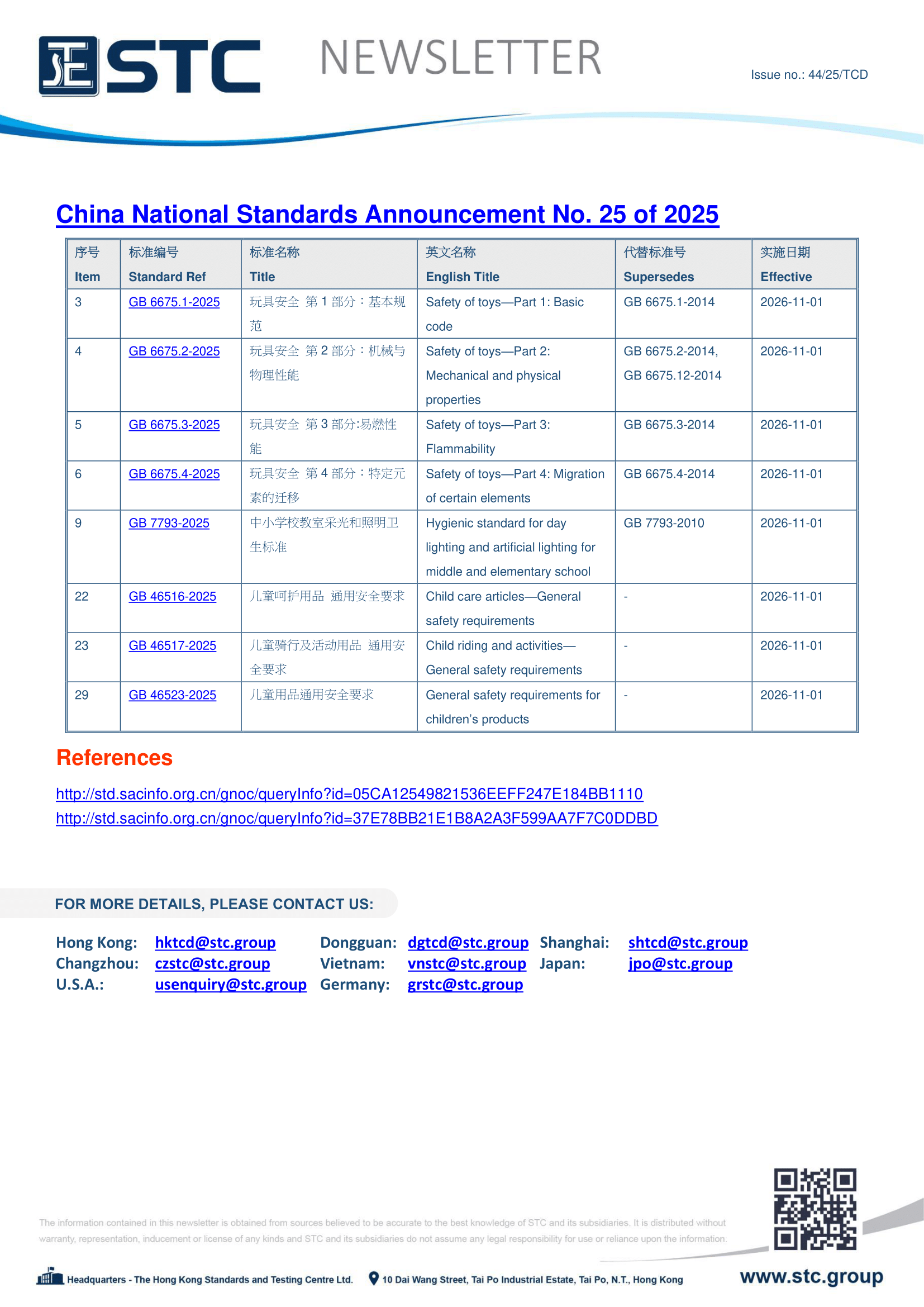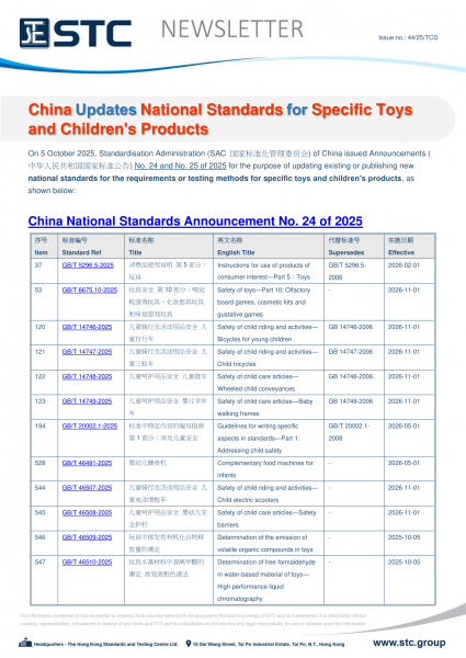 On 5 October 2025, Standardisation Administration (SAC 国家标准化管理委员会) of China issued Announcements (中华人民共和国国家标准公告) No. 24 and No. 25 of 2025 for the purpose of updating existing or publishing new national standards for the requirements or testing methods for specific toys and children’s products, as shown below: