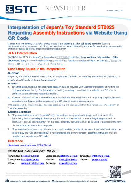 On 24 October 2025, the Japan Toy Association (日本玩具協会) published the operational interpretation of this clause specifically on the method of providing assembly instructions via a website using a QR code (組立指示書の提供方法(QR コードを介した Web サイトでの提供))