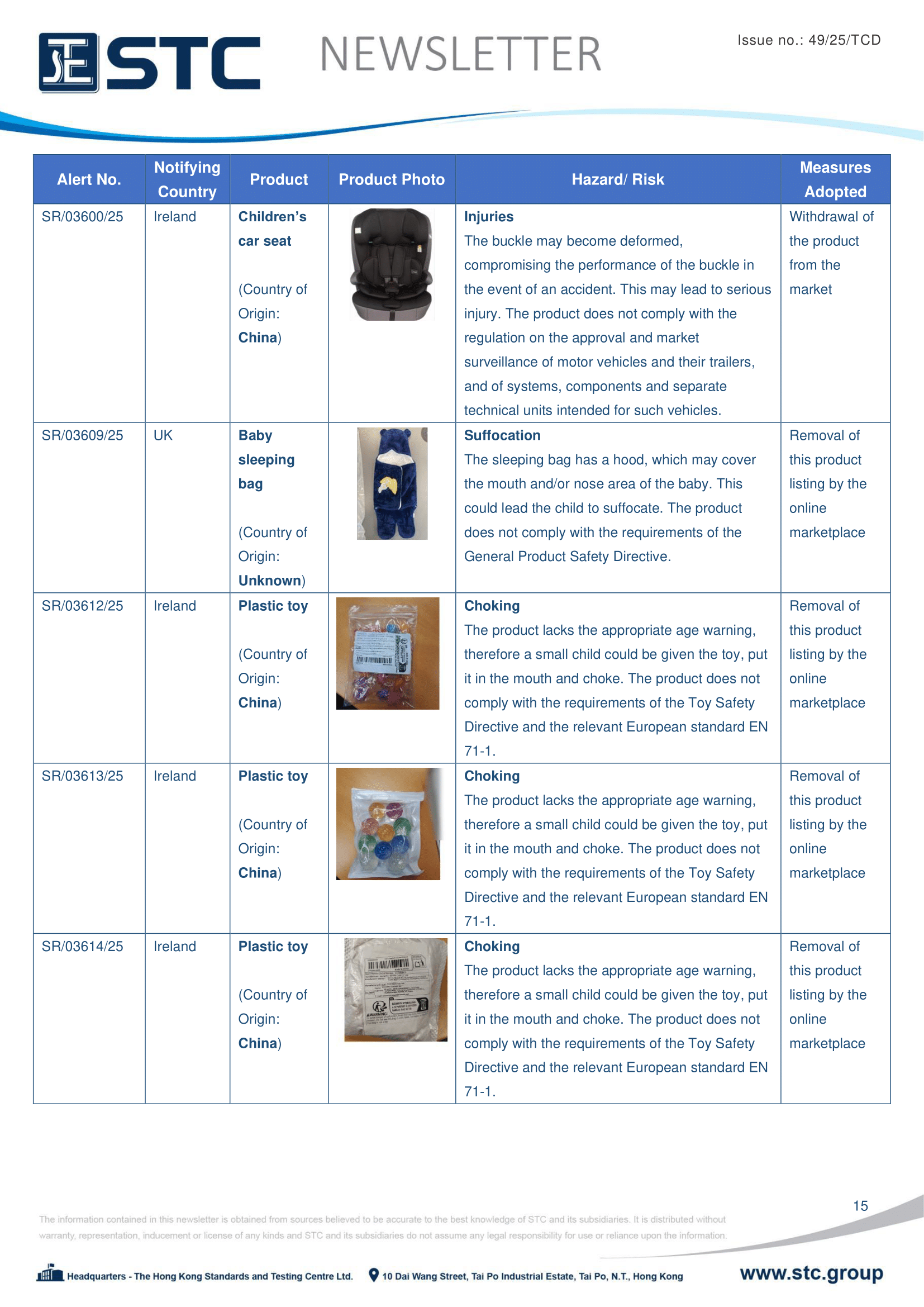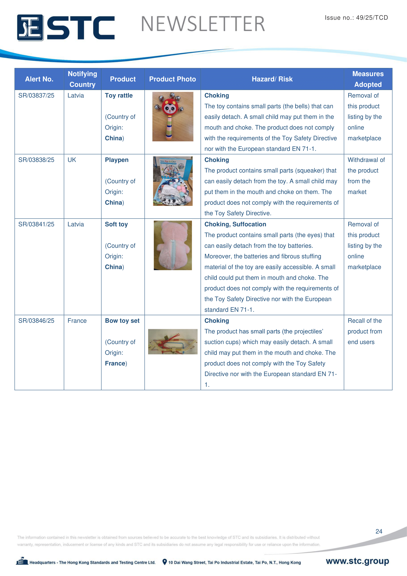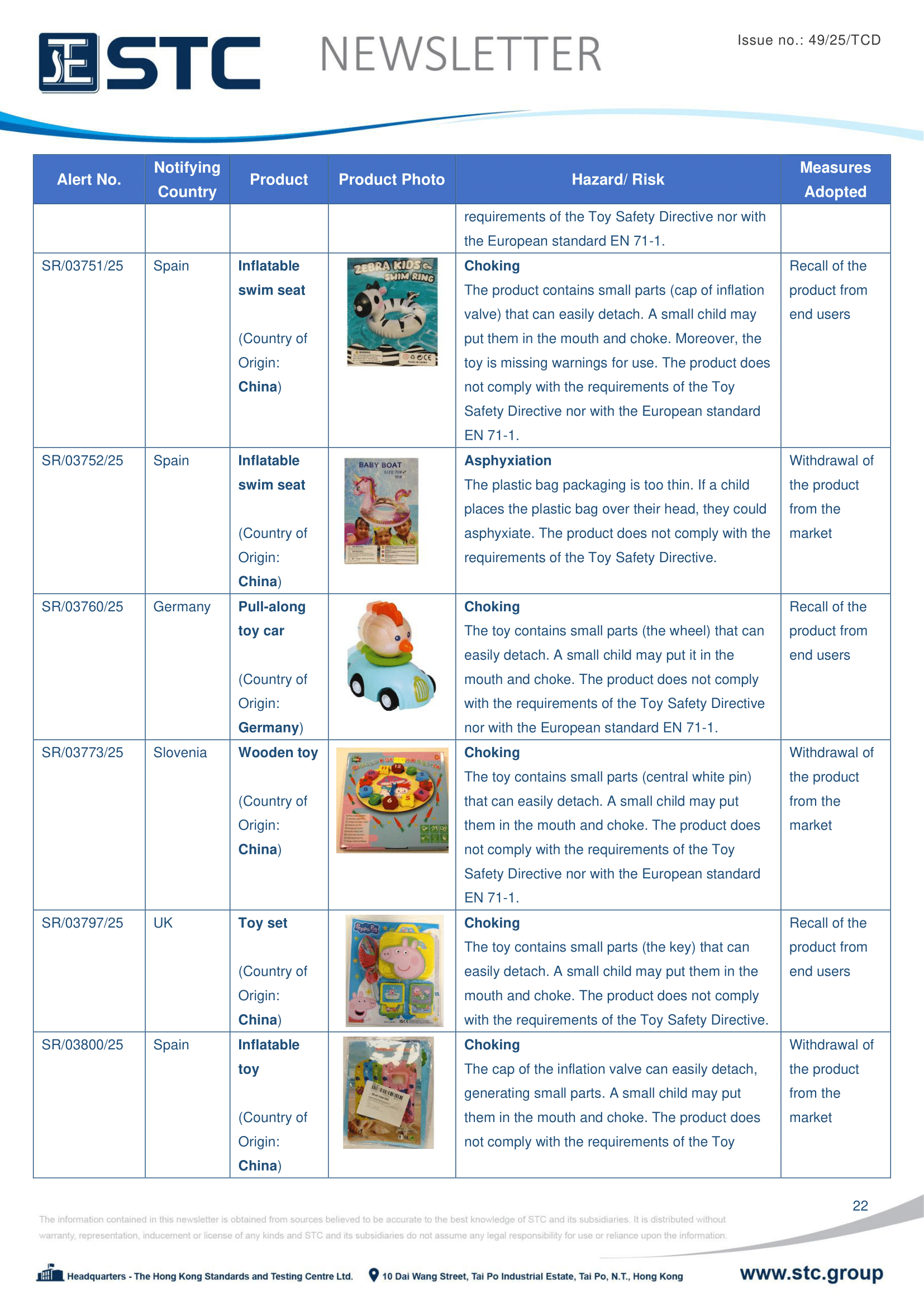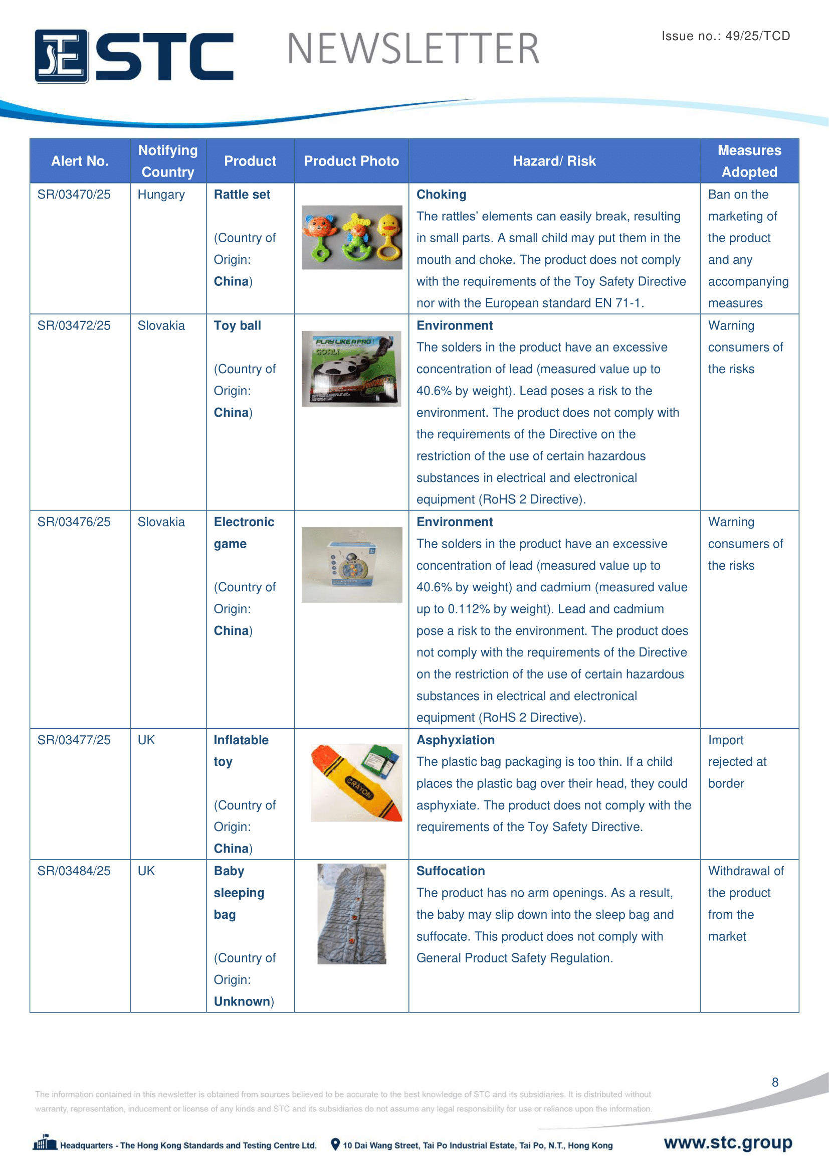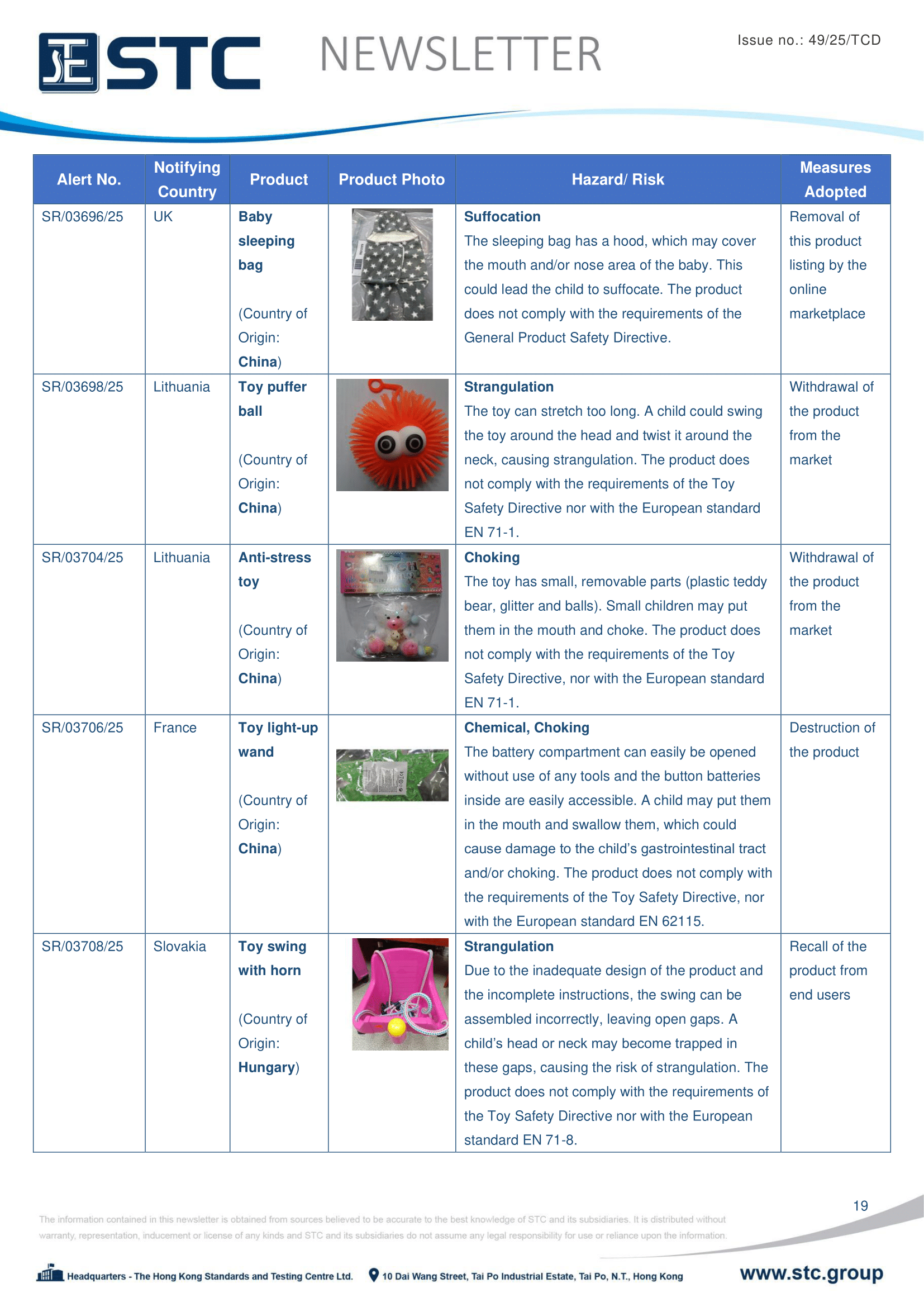 The official contact points of the Member and EFTA-EEA States provide the information published in these weekly overviews. Under the terms of Annex II.10 of the General Product Safety Directive (2001/95/EC) responsibility for the information provided lies with the notifying party. The Commission does not take any responsibility for the accuracy of the information provided.