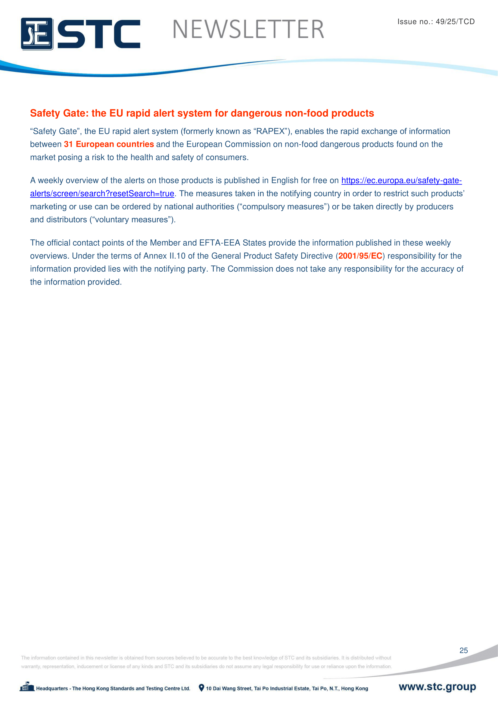 “Safety Gate”, the EU rapid alert system (formerly known as ‘RAPEX’), enables the rapid exchange of information between 31 European countries and the European Commission on non-food dangerous products found on the market posing a risk to the health and safety of consumers.