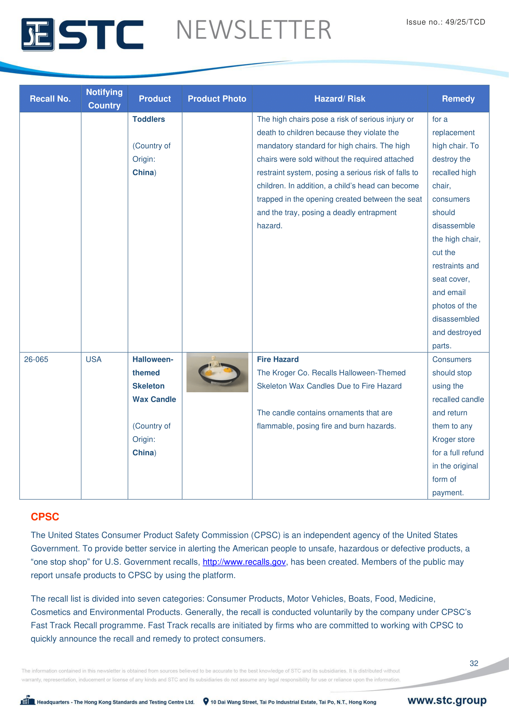 The United States Consumer Product Safety Commission (CPSC) is an independent agency of the United States government. To provide better service in alerting the American people to unsafe, hazardous or defective products, a “one stop shop” for U.S. Government recalls, http://www.recalls.gov, has been created. Members of the public may report unsafe products to CPSC by using the platform.