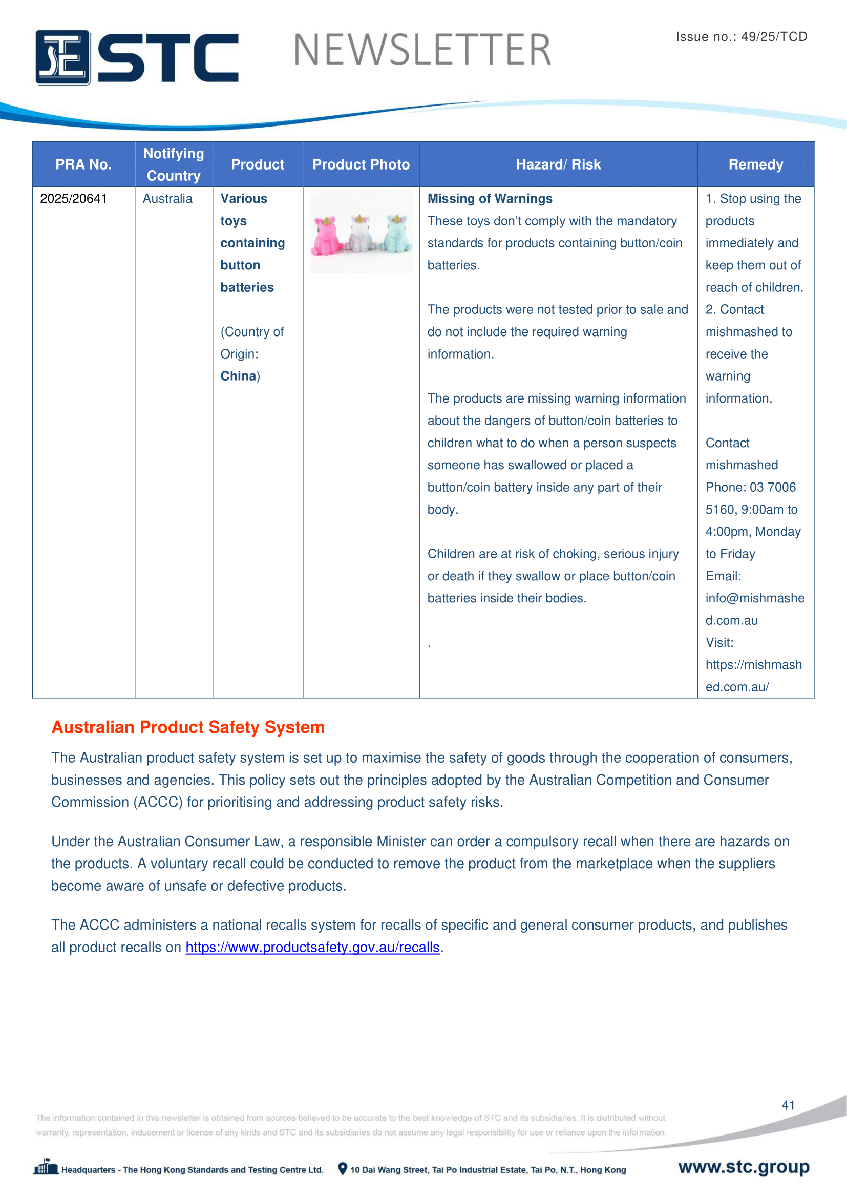 The ACCC administers a national recall system for recalls of specific and general consumer products, and publishes all product recalls on https://www.productsafety.gov.au/recalls.