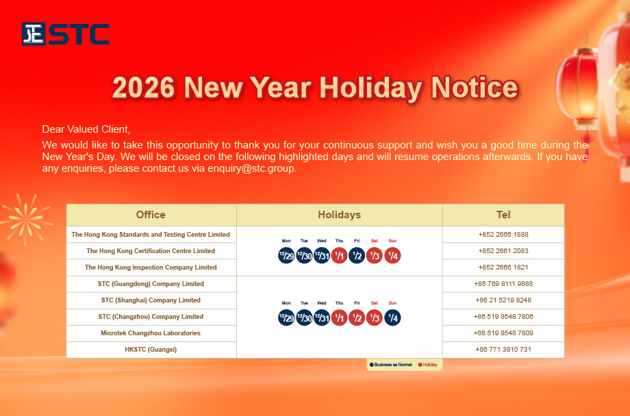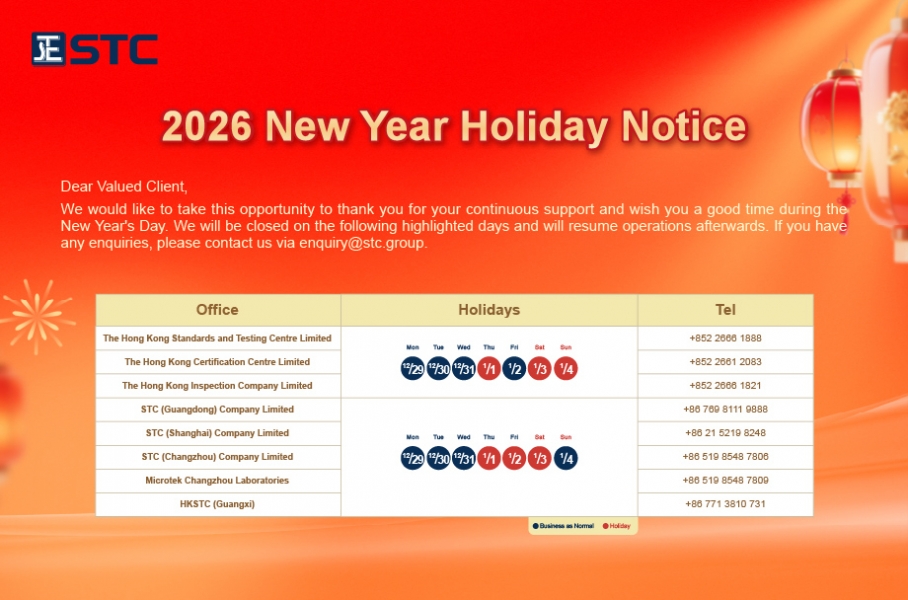 We would like to take this opportunity to thank you for your continuous support and wish you a good time during the New Year's Day. We will be closed on the following highlighted days and will resume operations afterwards. If you have any enquiries, please contact us via enquiry@stc.group.