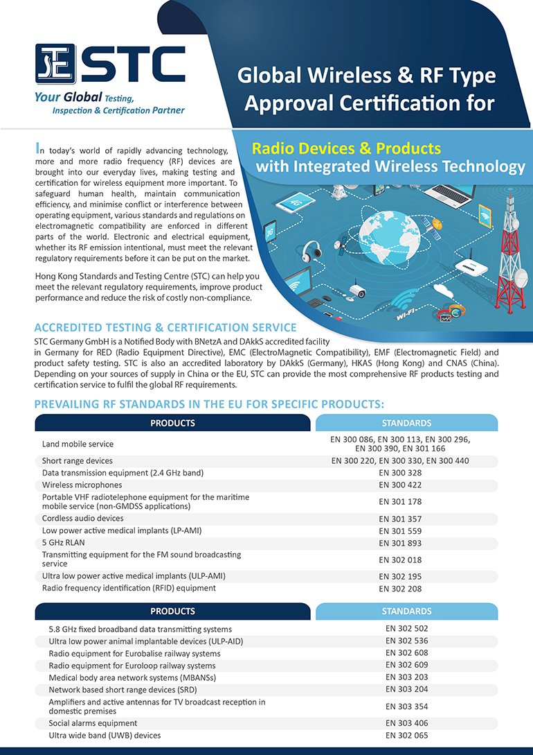 STC Germany GmbH is a Notified Body with BNetzA and DAkkS accredited facility in Germany for RED (Radio Equipment Directive), EMC (ElectroMagnetic Compatibility), EMF (Electromagnetic Field) and product safety testing. STC is also an accredited laboratory by DAkkS (Germany), HOKLAS (Hong Kong) and CNAS (China). Depending on your sources of supply in China or the EU, STC can provide the most comprehensive RF products testing and certification service to fulfill the global RF requirements.