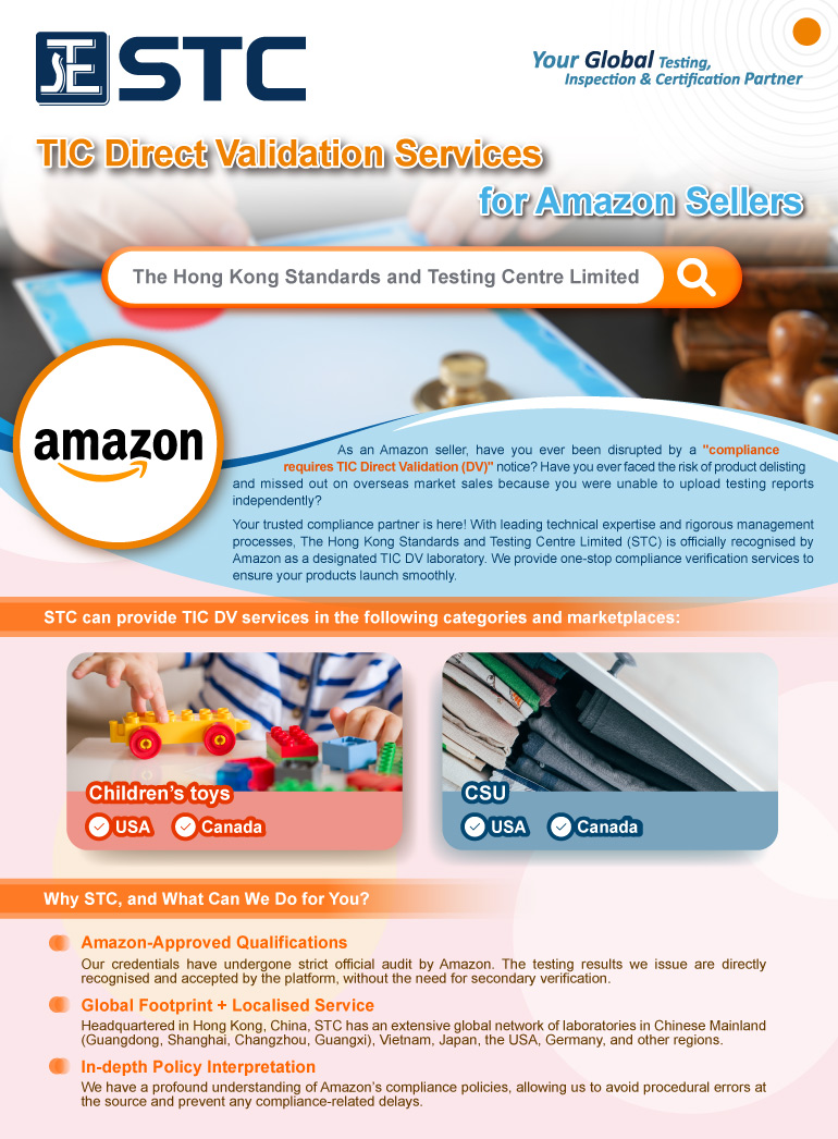 Your trusted compliance partner is here! With leading technical expertise and rigorous management processes, The Hong Kong Standards and Testing Centre Limited (STC) is officially recognised by Amazon as a designated TIC DV laboratory. We provide one-stop compliance verification services to ensure your products launch smoothly.