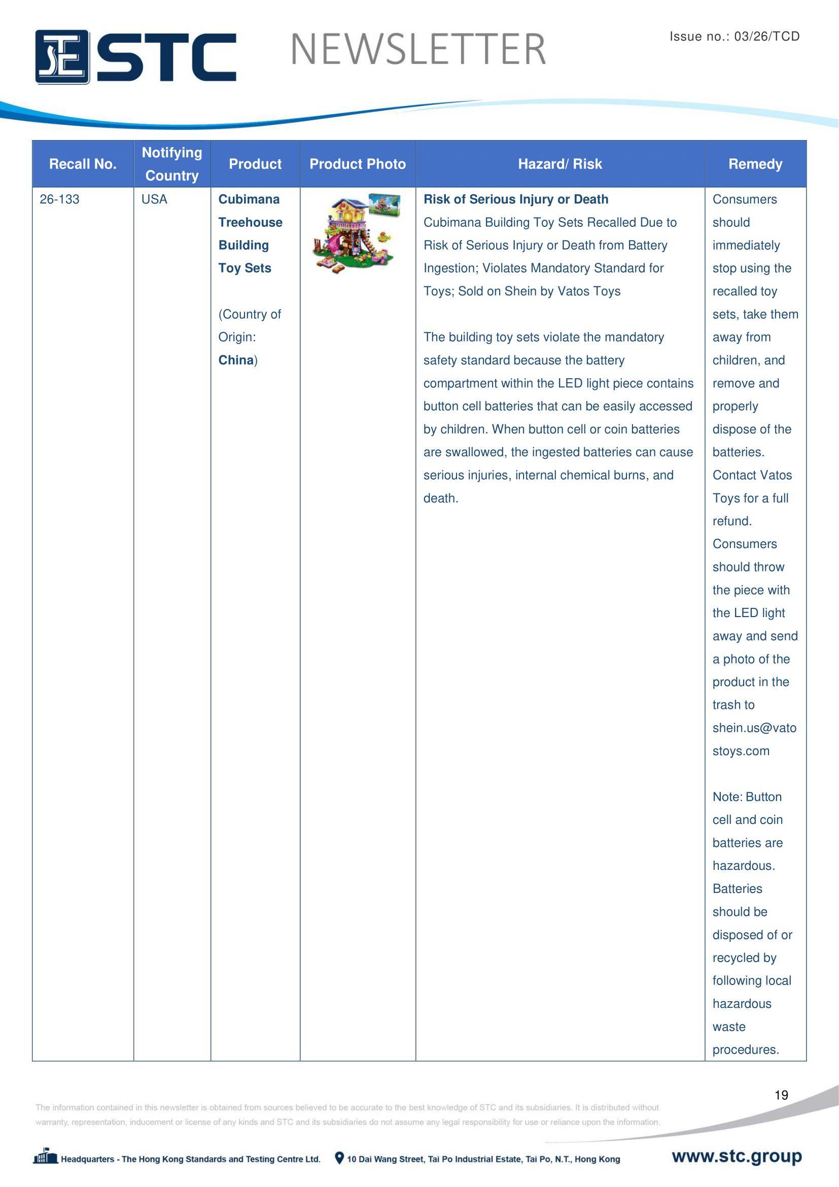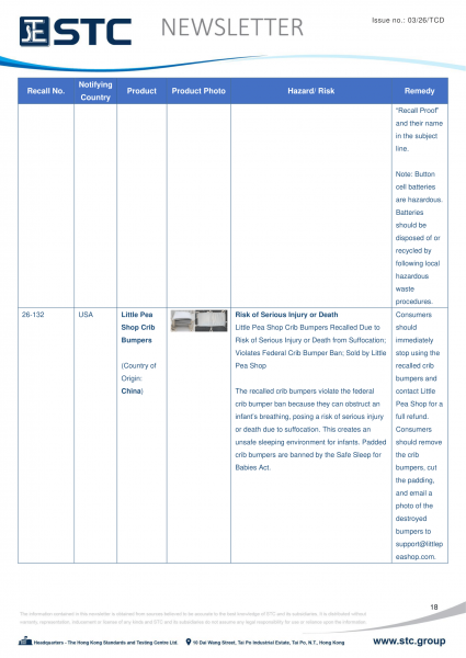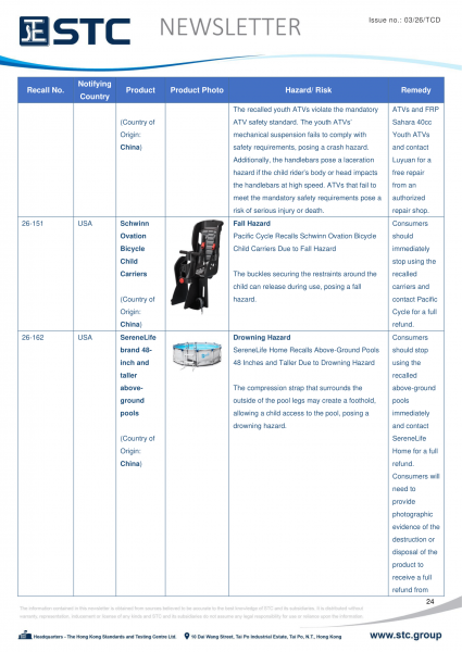 The recall list is divided into seven categories: Consumer Products, Motor Vehicles, Boats, Food, Medicine, Cosmetics and Environmental Products. Generally, the recall is conducted voluntarily by the company under CPSC’s Fast Track Recall programme. Fast Track recalls are initiated by firms who are committed to working with CPSC to quickly announce the recall and remedy to protect consumers.