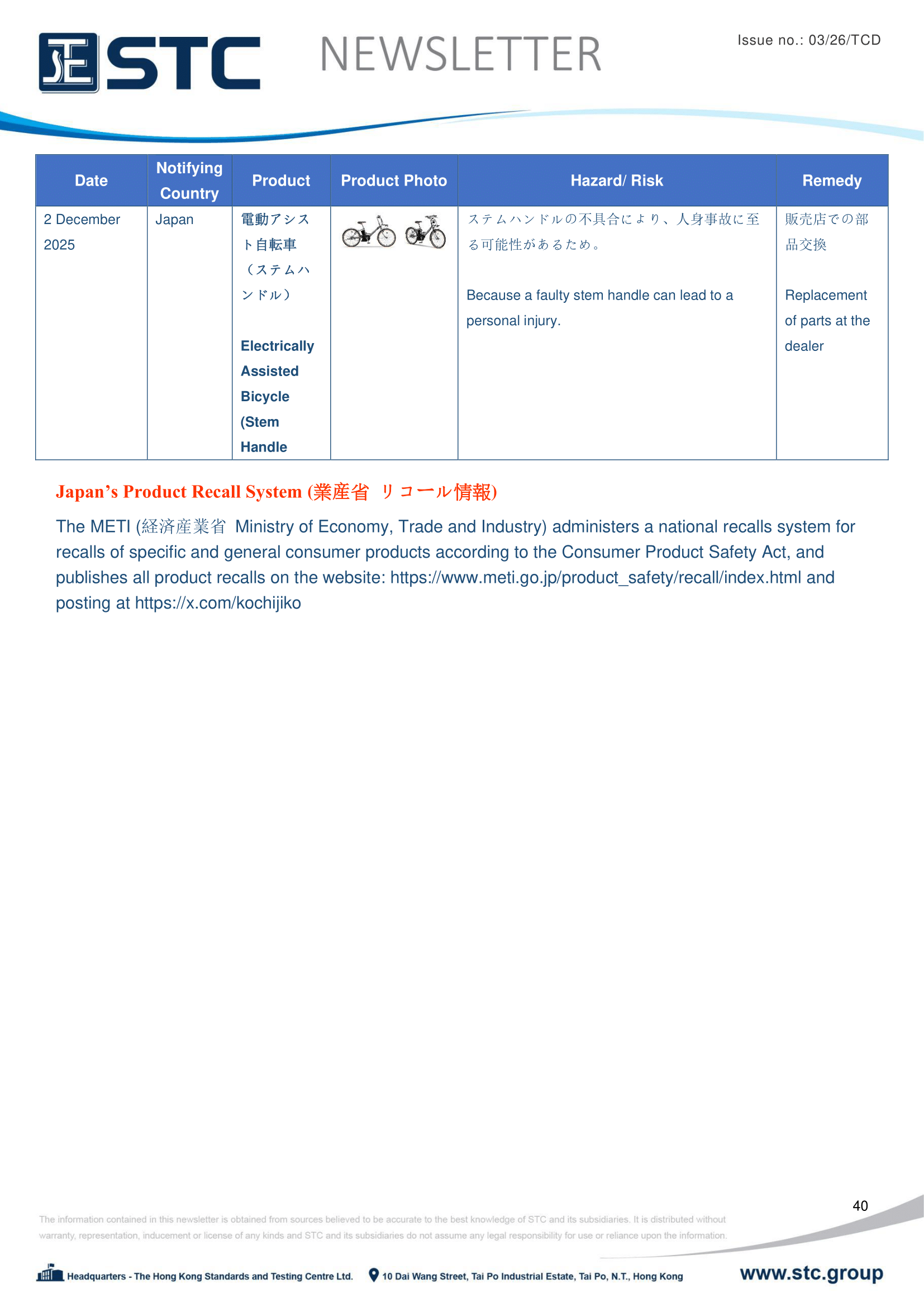 The METI (経済産業省Ministry of Economy, Trade and Industry) administers a national recalls system for recalls of specific and general consumer products according to the Consumer Product Safety Act, and publishes all product recalls on the website: https://www.meti.go.jp/product_safety/recall/index.html and posting at https://x.com/kochijiko.