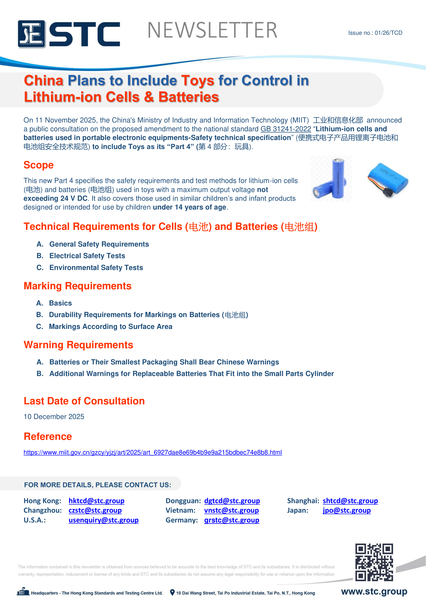 On 11 November 2025, the China's Ministry of Industry and Information Technology (MIIT) 工业和信息化部 announced a public consultation on the proposed amendment to the national standard GB 31241-2022 “Lithium-ion cells and batteries used in portable electronic equipments-Safety technical specification” (便携式电子产品用锂离子电池和电池组安全技术规范) to include Toys as its “Part 4” (第4部分:玩具).