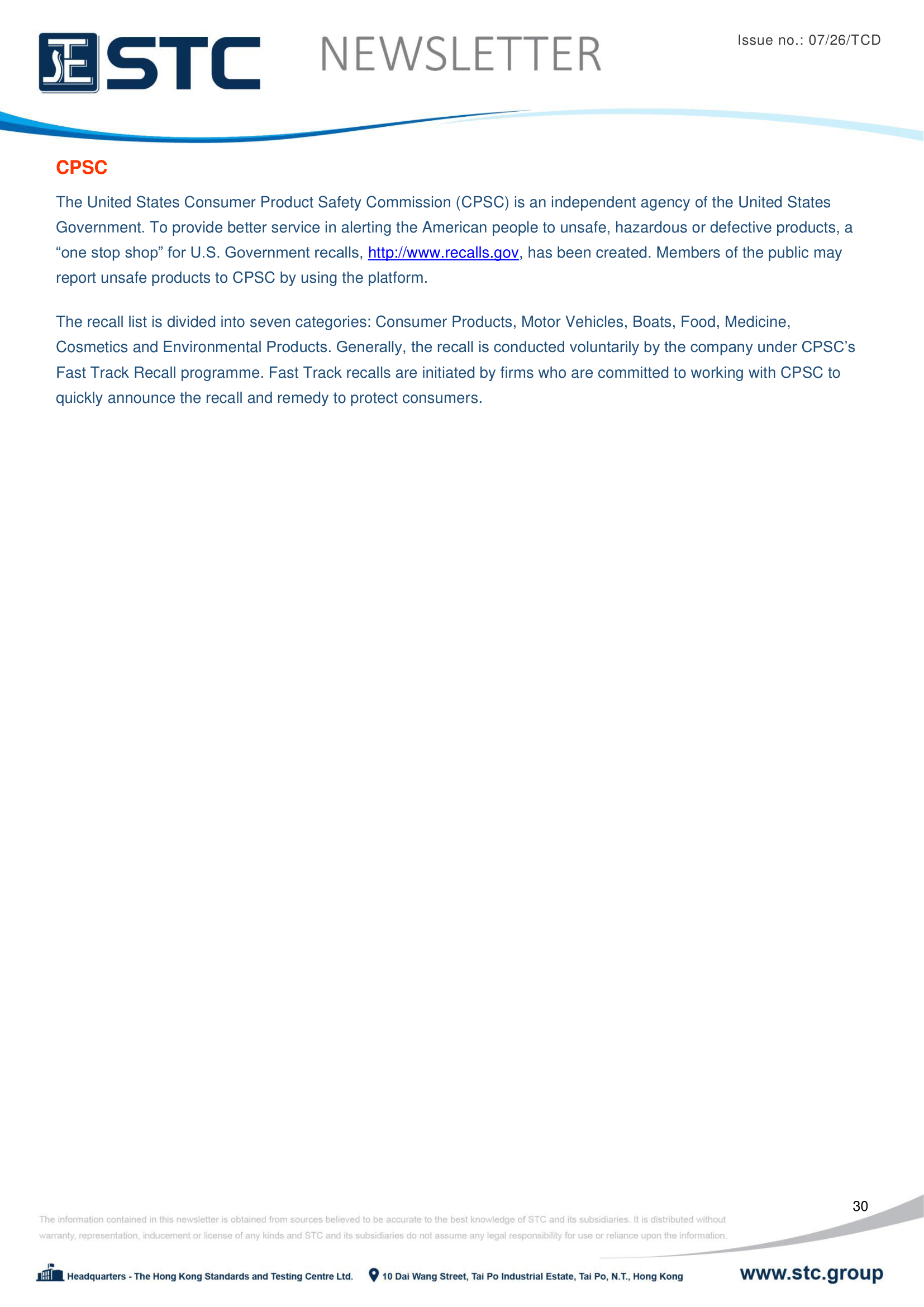 The United States Consumer Product Safety Commission (CPSC) is an independent agency of the United States government. To provide better service in alerting the American people to unsafe, hazardous or defective products, a “one stop shop” for U.S. Government recalls, http://www.recalls.gov, has been created. Members of the public may report unsafe products to CPSC by using the platform.