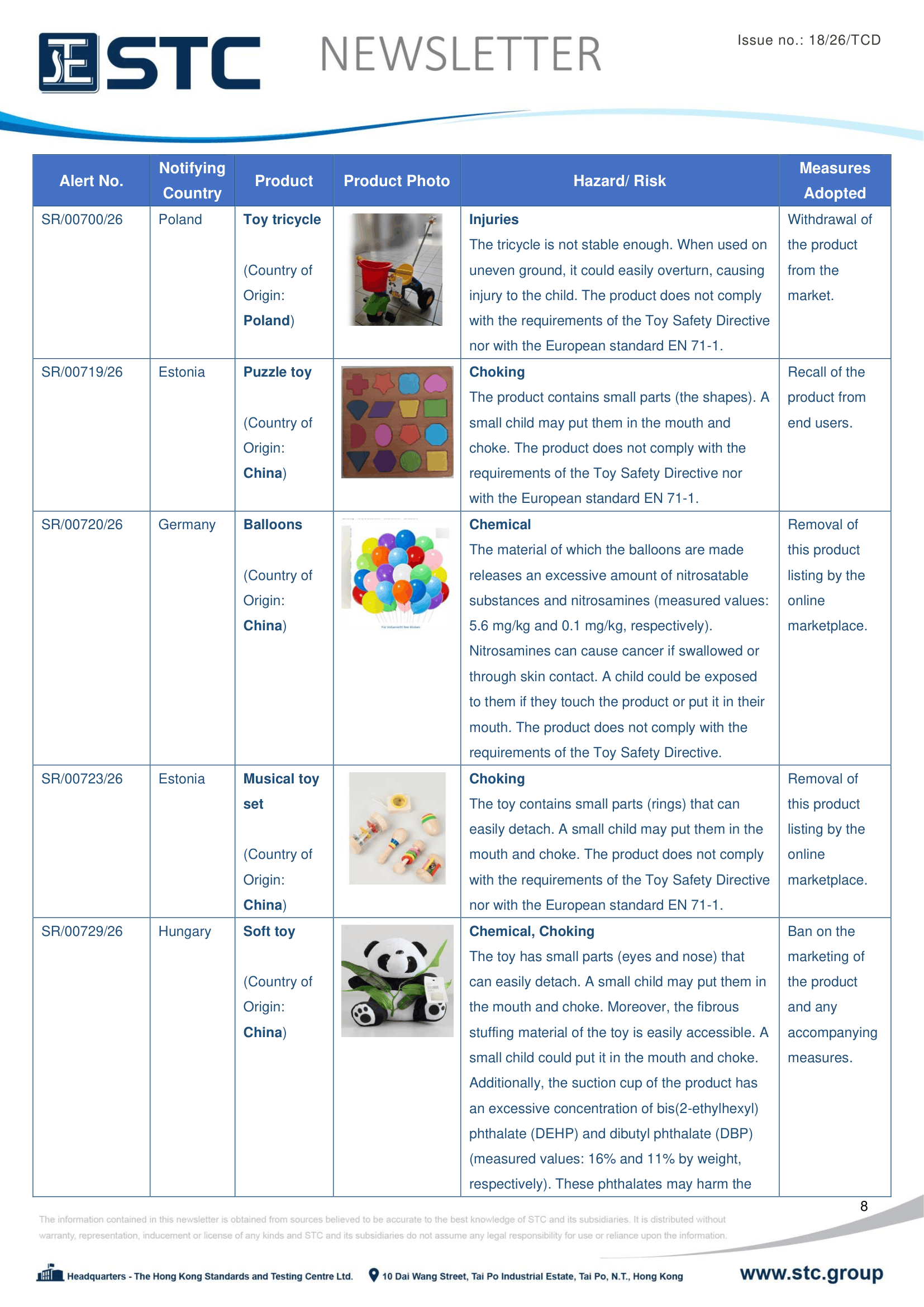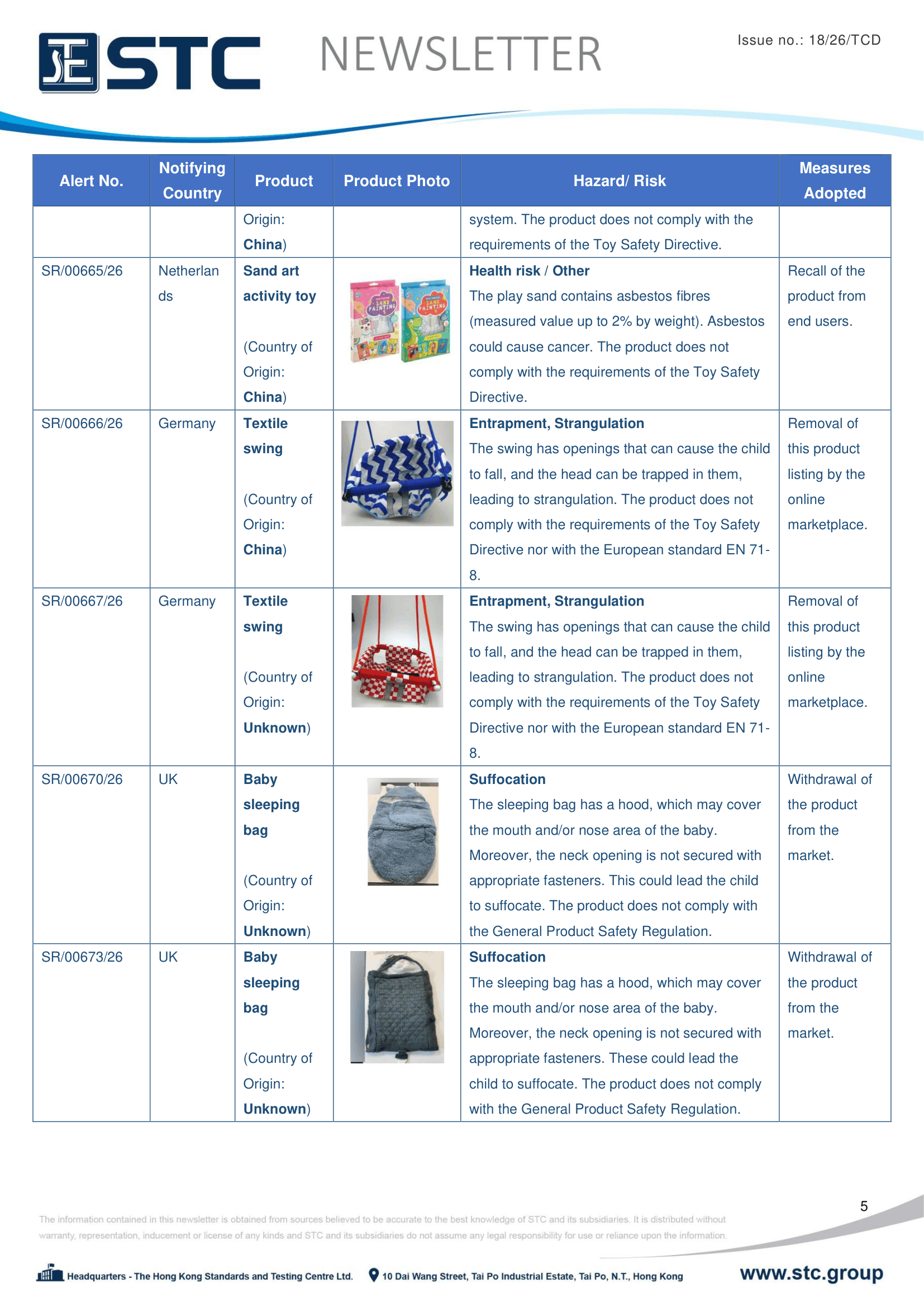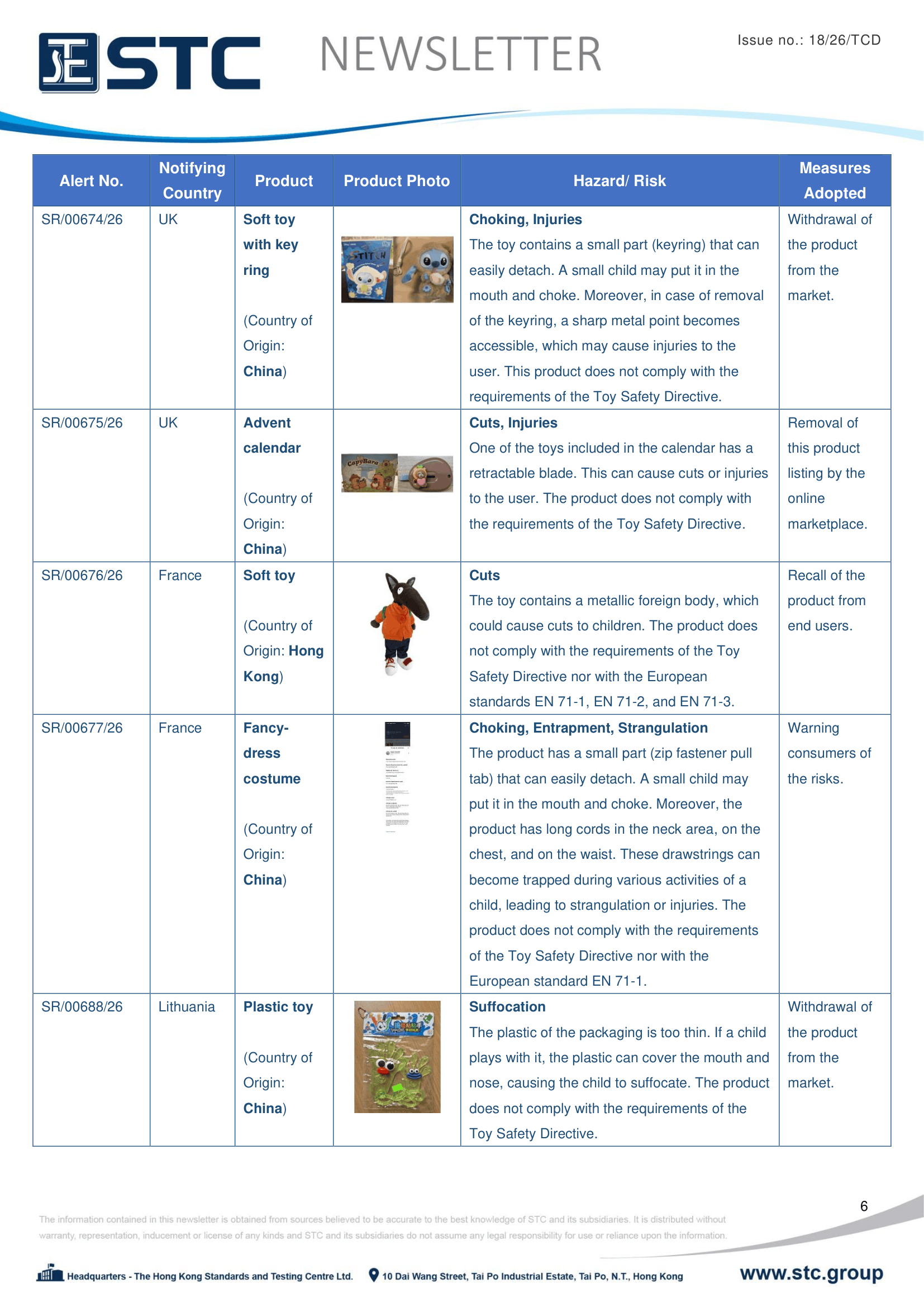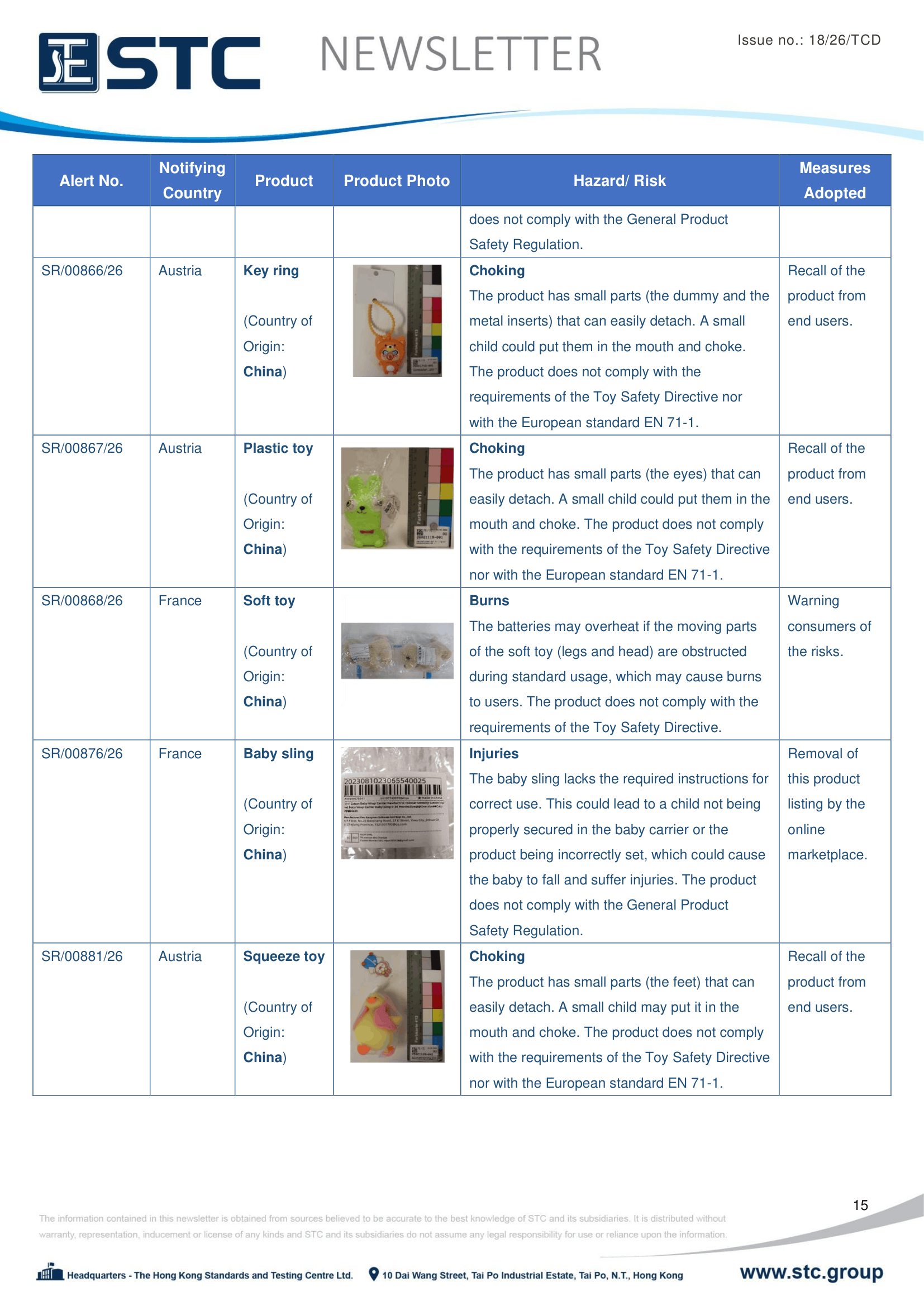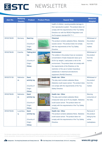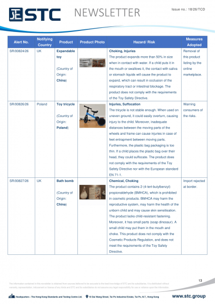 The official contact points of the Member and EFTA-EEA States provide the information published in these weekly overviews. Under the terms of Annex II.10 of the General Product Safety Directive (2001/95/EC) responsibility for the information provided lies with the notifying party. The Commission does not take any responsibility for the accuracy of the information provided.