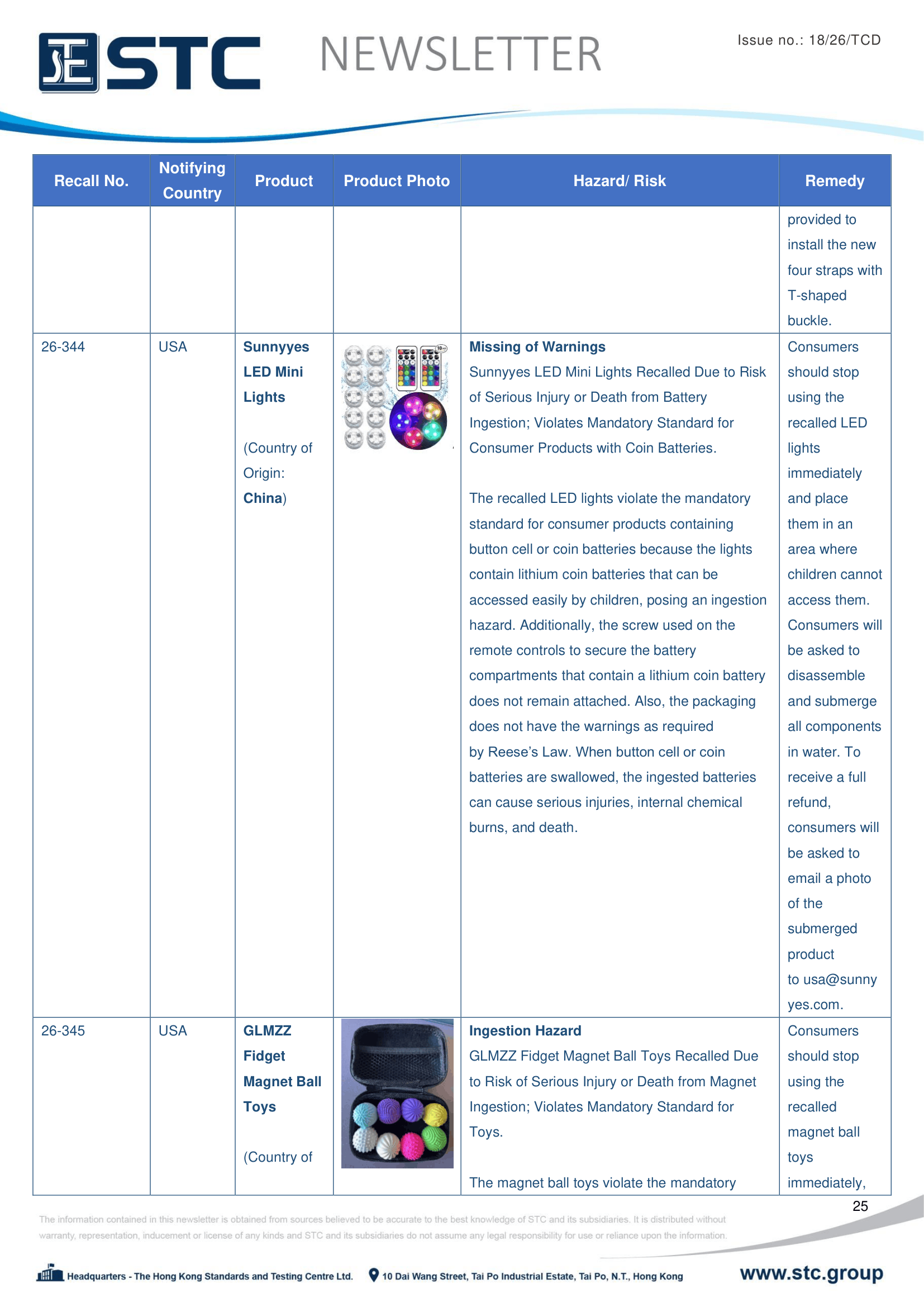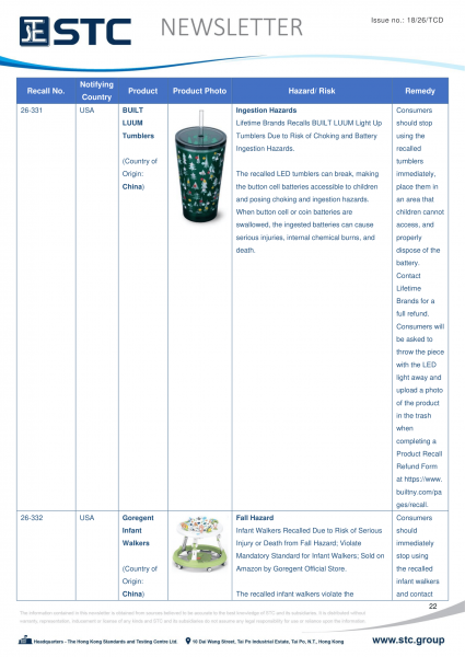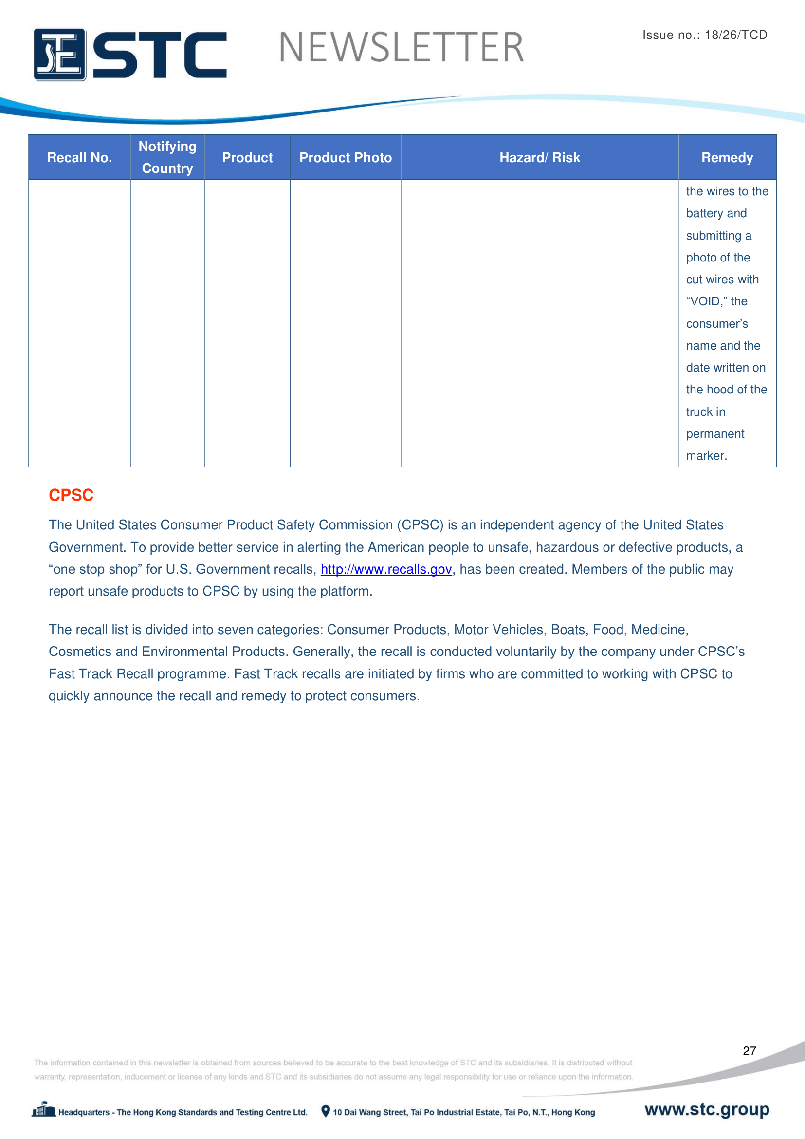 The recall list is divided into seven categories: Consumer Products, Motor Vehicles, Boats, Food, Medicine, Cosmetics and Environmental Products. Generally, the recall is conducted voluntarily by the company under CPSC’s Fast Track Recall programme. Fast Track recalls are initiated by firms who are committed to working with CPSC to quickly announce the recall and remedy to protect consumers.