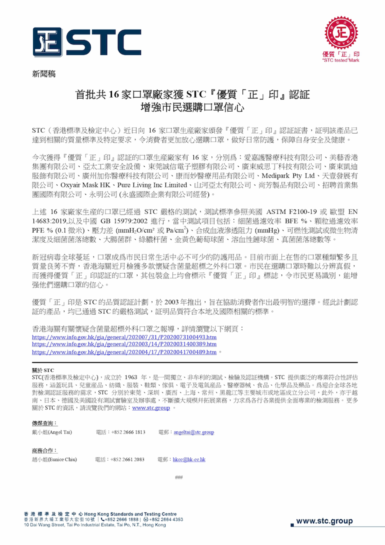 STC(香港标准及检定中心)近日向16家口罩生产厂家颁发『优质「正」印』认证证书,证明该产品已达到相关的质量标准及特定要求,令消费者更加放心选购口罩,做好日常防护,保障自身安全及健康。