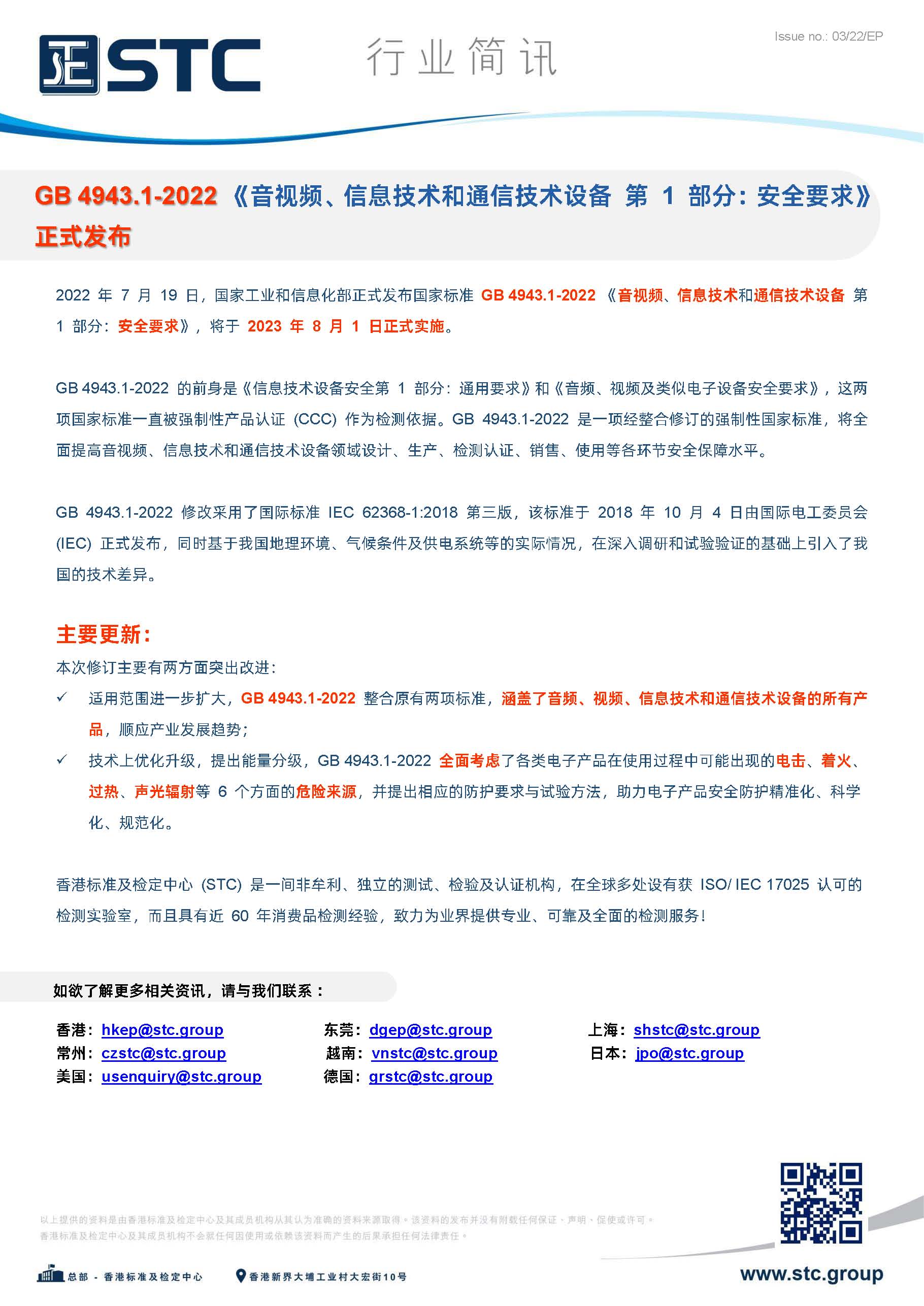 2022 年 7 月 19 日,国家工业和信息化部正式发布国家标准GB 4943.1-2022 《音视频、信息技术和通信技术设备第1部分:安全要求》,将于2023 年 8 月 1 日正式实施。