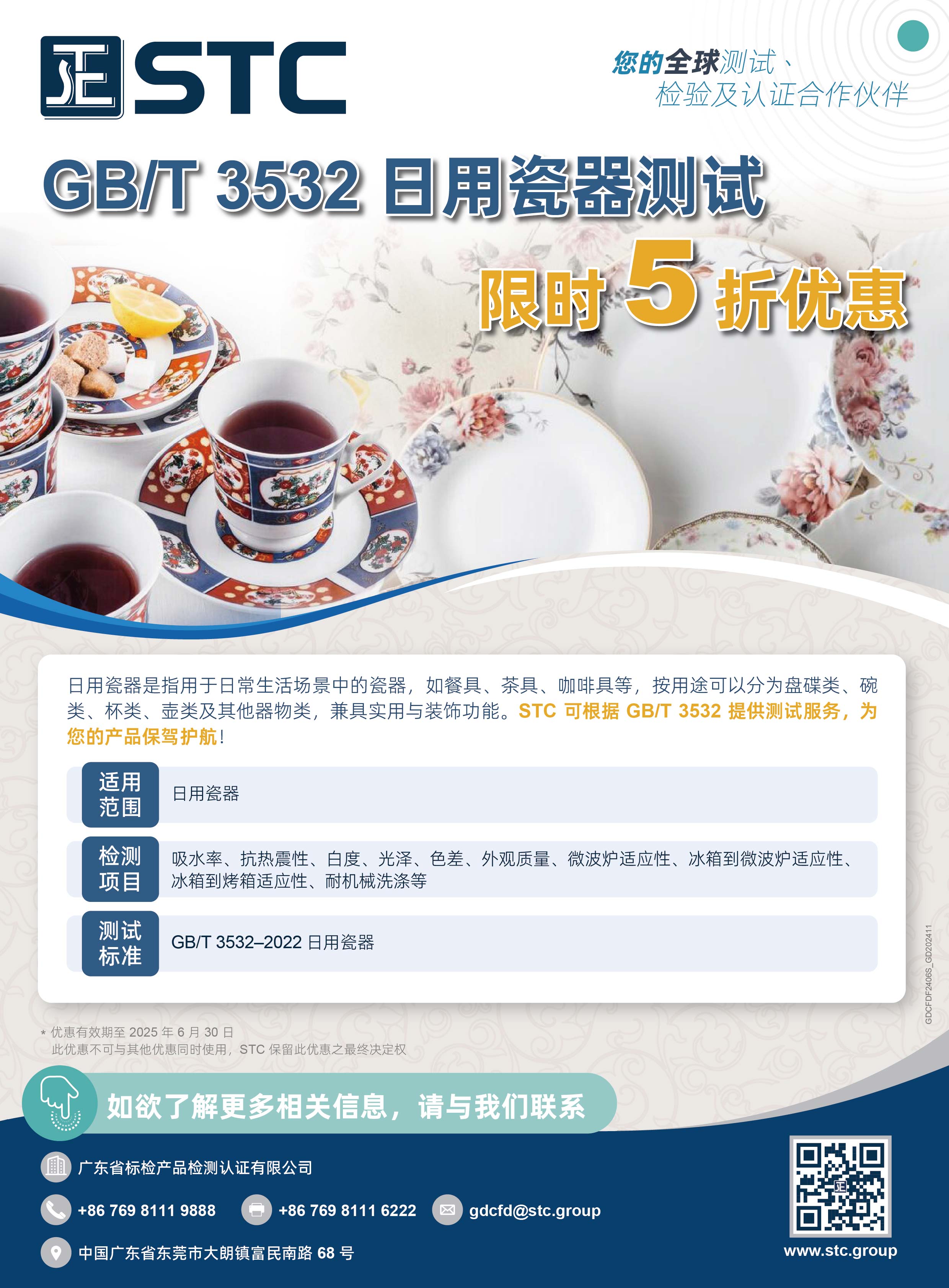 日用瓷器是指用于日常生活场景中的瓷器,如餐具、茶具、咖啡具等,按用途可以分为盘碟类、碗类、杯类、壶类及其他器物类,兼具实用与装饰功能。STC 可根据 GB/T 3532 提供测试服务,为您的产品保驾护航!
