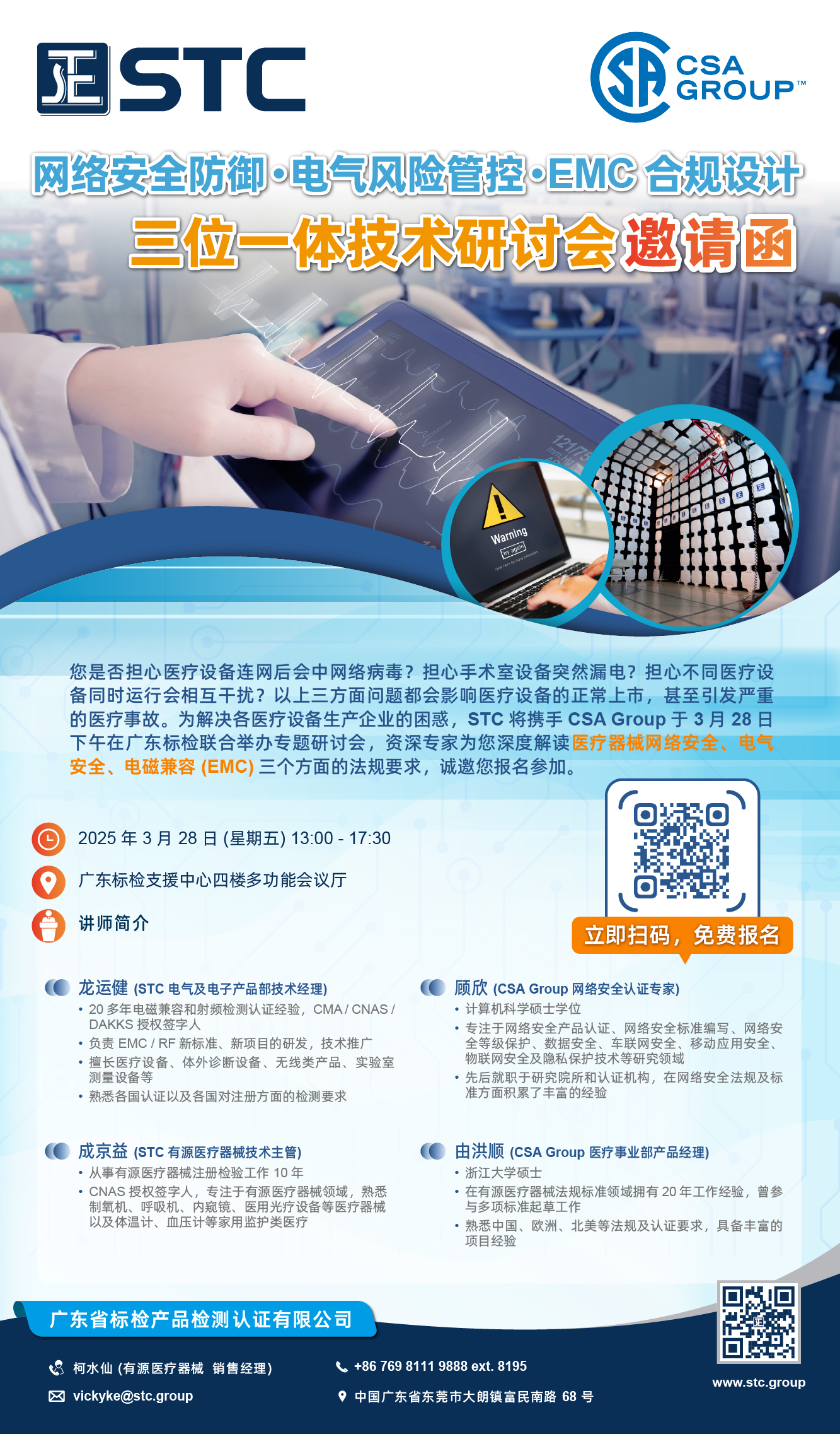 您是否担心医疗设备连网后会中网络病毒?担心手术室设备突然漏电?担心不同医疗设备同时运行会相互干扰?以上三方面问题都会影响医疗设备的正常上市,甚至引发严重的医疗事故。为解决各医疗设备生产企业的困惑,STC 将携手 CSA Group 于 3 月 28 日下午在广东标检联合举办专题研讨会,资深专家为您深度解读医疗器械网络安全、电气安全、电磁兼容 (EMC) 三个方面的法规要求,诚邀您报名参加。