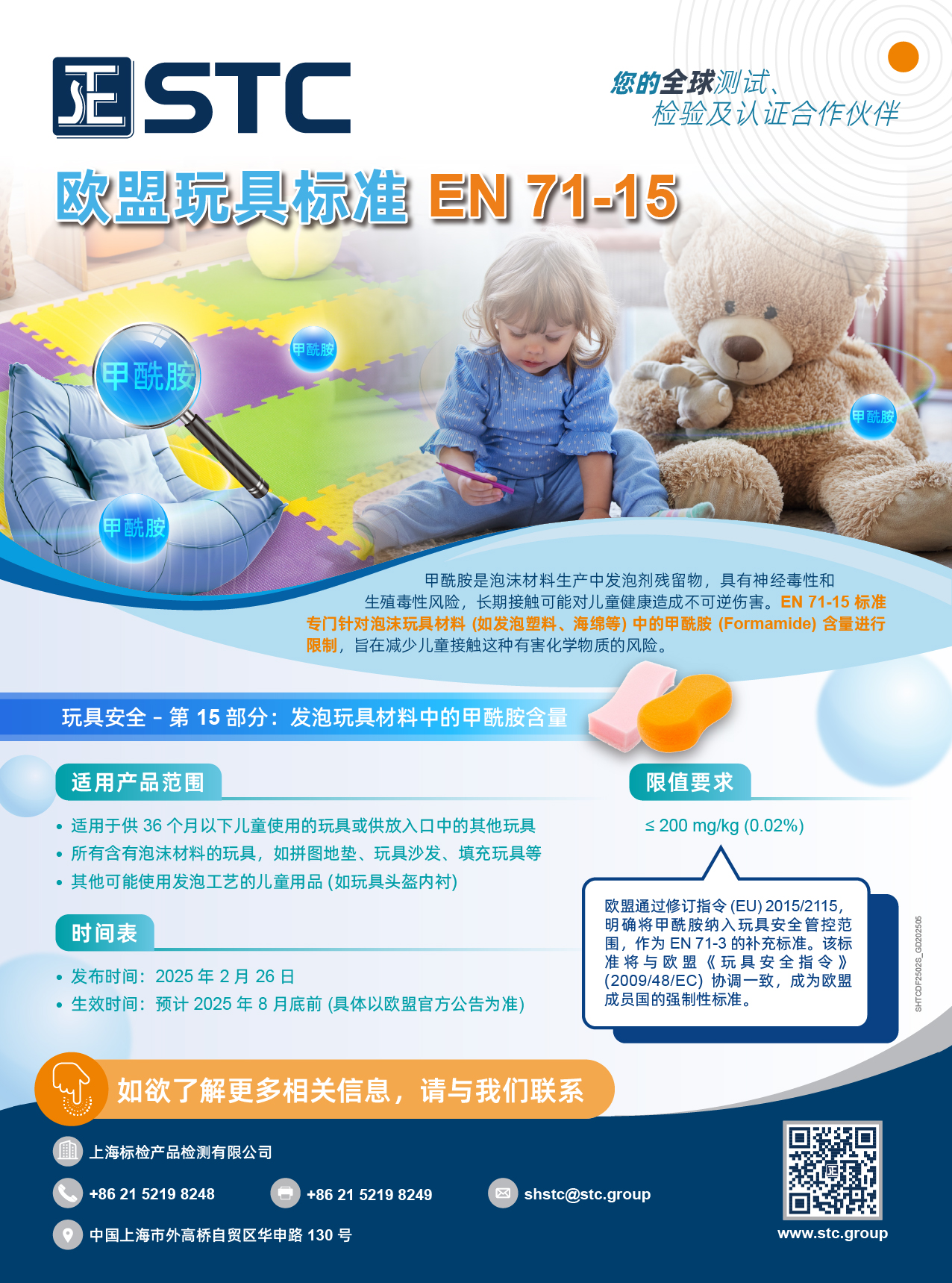 甲酰胺是泡沫材料生产中发泡剂残留物,具有神经毒性和生殖毒性风险,长期接触可能对儿童健康造成不可逆伤害。EN 71-15 标准专门针对泡沫玩具材料 (如发泡塑料、海绵等) 中的甲酰胺 (Formamide) 含量进行限制,旨在减少儿童接触这种有害化学物质的风险。