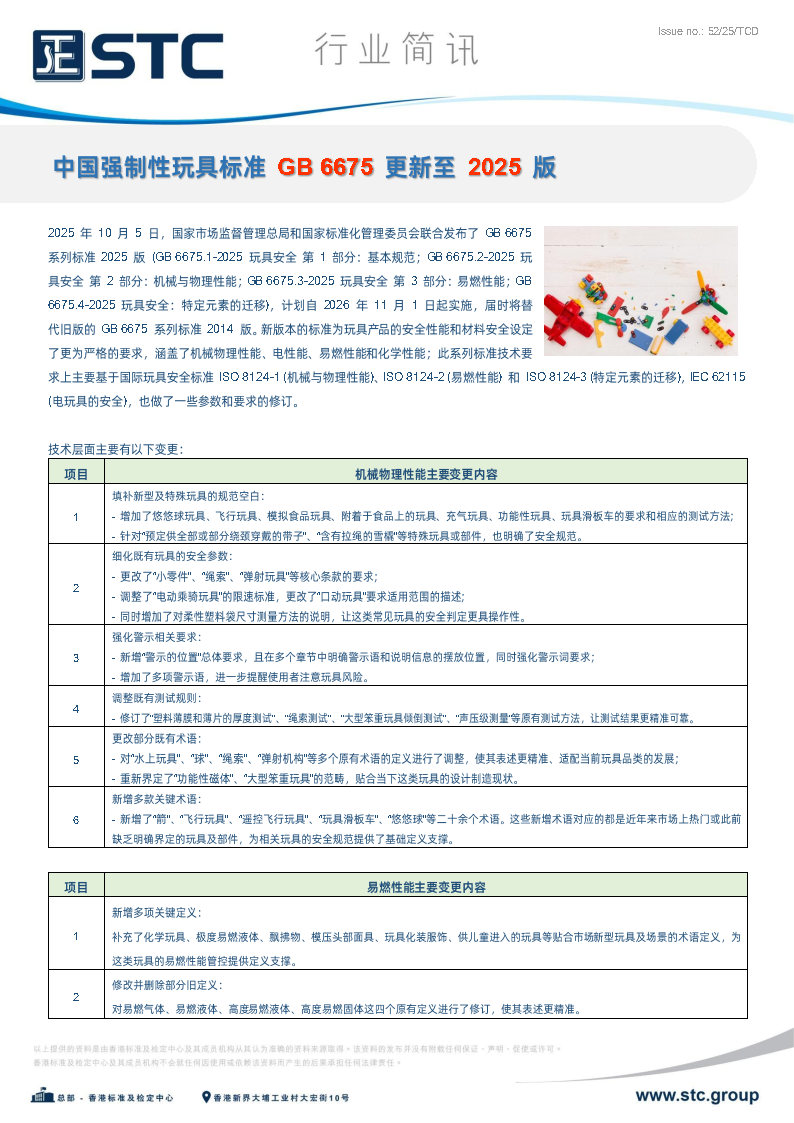 2025 年 10 月 5 日,国家市场监督管理总局和国家标准化管理委员会联合发布了 GB 6675 系列标准 2025 版 (GB 6675.1-2025 玩具安全第 1 部分:基本规范;GB 6675.2-2025 玩具安全第 2 部分:机械与物理性能;GB 6675.3-2025 玩具安全第 3 部分:易燃性能;GB 6675.4-2025 玩具安全:特定元素的迁移),计划自 2026 年 11 月 1 日起实施,届时将替代旧版的 GB 6675 系列标准 2014 版。新版本的标准为玩具产品的安全性能和材料安全设定了更为严格的要求,涵盖了机械物理性能、电性能、易燃性能和化学性能;此系列标准技术要求上主要基于国际玩具安全标准 ISO 8124-1 (机械与物理性能)、ISO 8124-2 (易燃性能) 和 ISO 8124-3 (特定元素的迁移),IEC 62115 (电玩具的安全),也做了一些参数和要求的修订。
