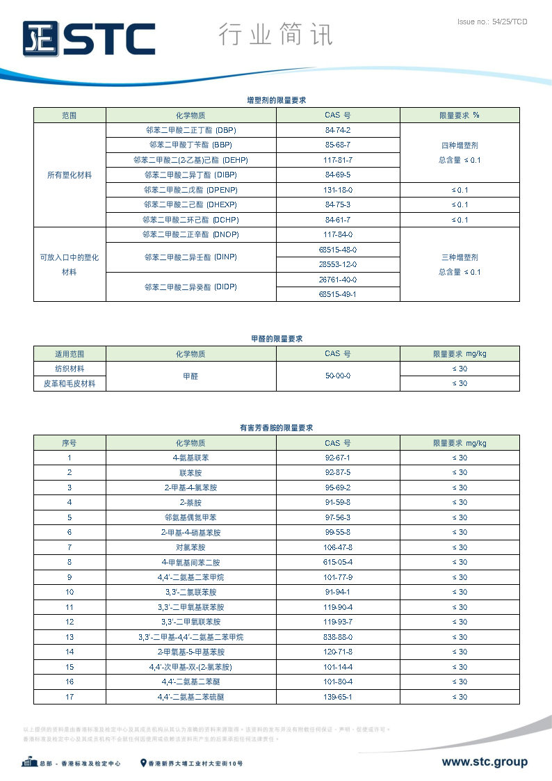 - 增加了增塑剂、甲醛、可分解有害芳香胺、pH (应符合 GB 18401 的 A 类规定)、可迁移 N-亚硝胺及 N-亚硝胺前体物和短链氯化石蜡的限量要求和测试方法。 |