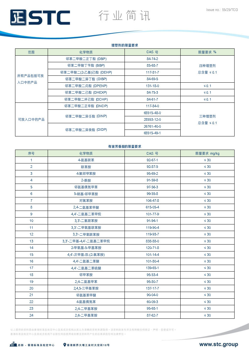 - 增加了增塑剂、甲醛、可分解有害芳香胺染料、pH (应符合 GB 18401 的 A 类规定)、可迁移 N-亚硝胺及N-亚硝胺前体物、短链氯化石蜡,和甲醛、苯、甲苯、二甲苯及总挥发性有机化合物 (TVOC) 的释放量的限量要求和测试方法。 |