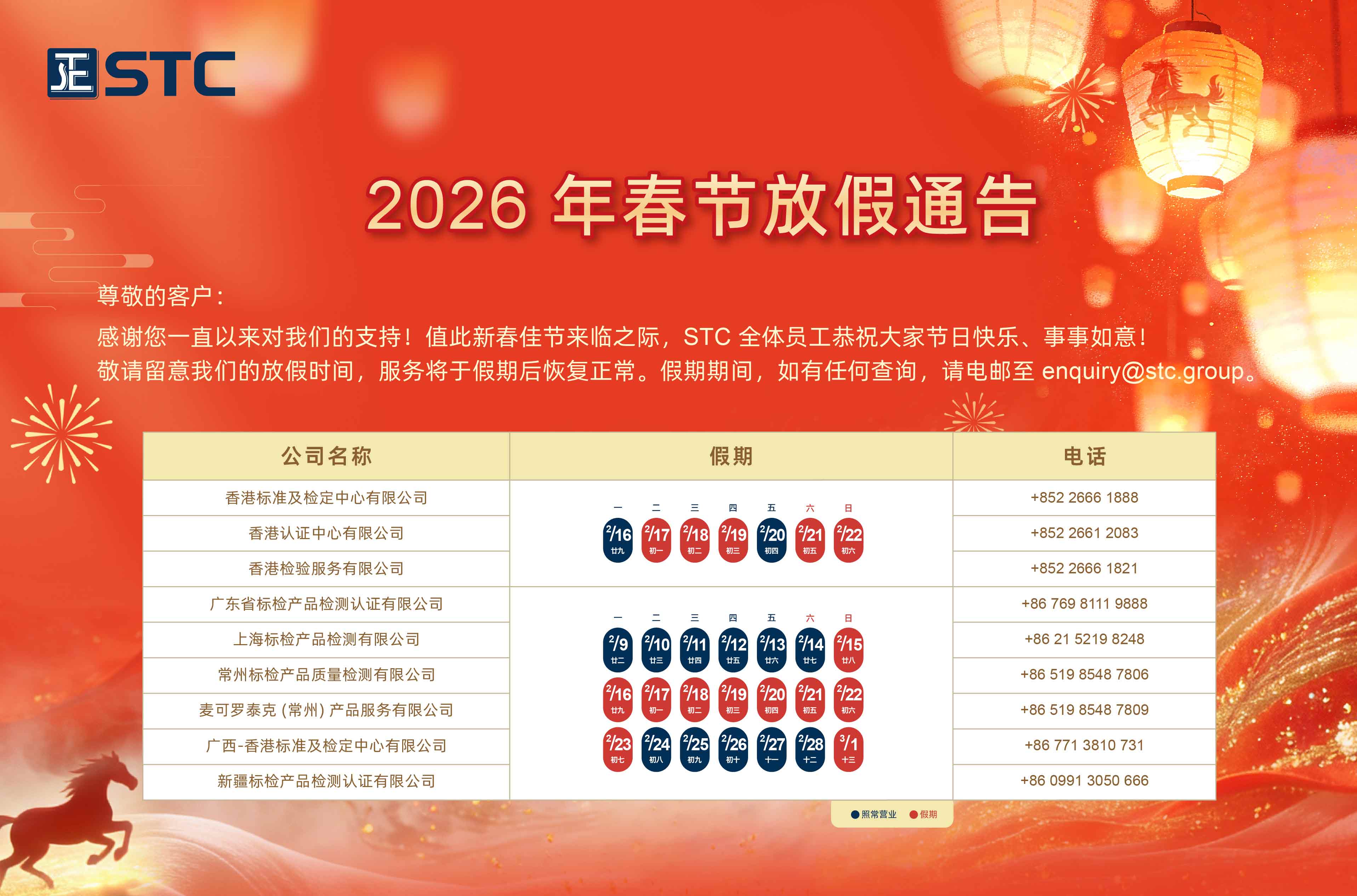尊敬的客户:感谢您一直以来对我们的支持!值此新春佳节来临之际,STC 全体员工恭祝大家节日快乐、事事如意!敬请留意我们的放假时间,服务将于假期后恢复正常。假期期间,如有任何查询,请电邮至 enquiry@stc.group。