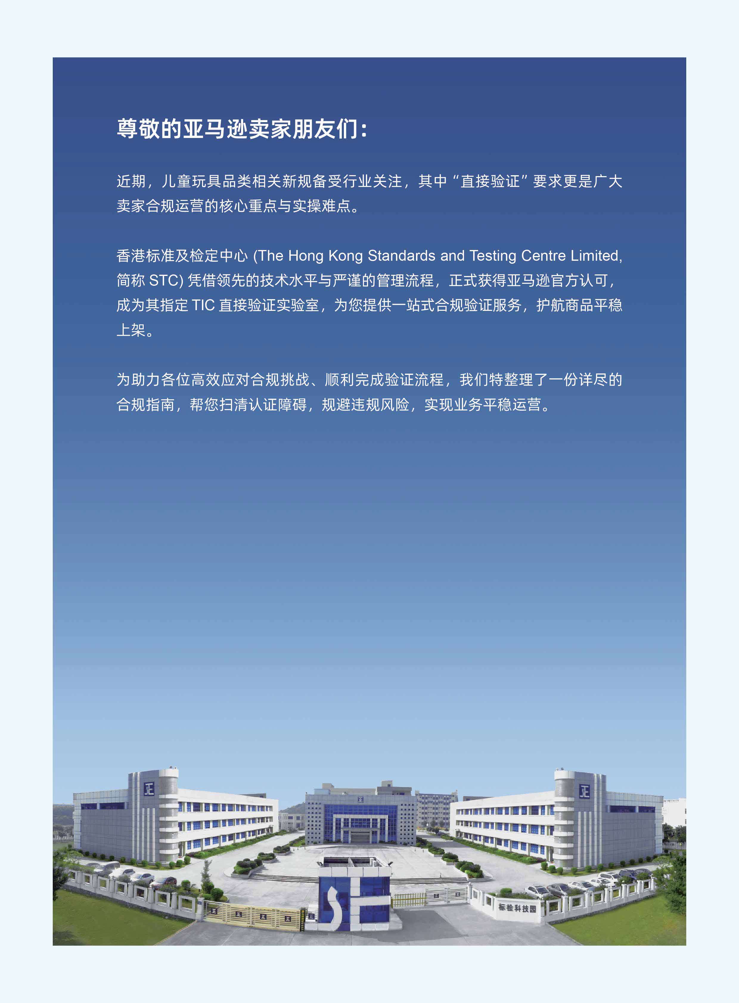 近期,儿童玩具品类相关新规备受行业关注,其中“直接验证”要求更是广大卖家合规运营的核心重点与实操难点。香港标准及检定中心 (The Hong Kong Standards and Testing Centre Limited 简称 STC) 凭借领先的技术水平与严谨的管理流程,正式获得亚马逊官方认可,成为其指定 TIC 直接验证实验室,为您提供一站式合规验证服务,护航商品平稳上架。为助力各位高效应对合规挑战、顺利完成验证流程,我们特整理了一份详尽的合规指南,帮您扫清认证障碍,规避违规风险,实现业务平稳运营。