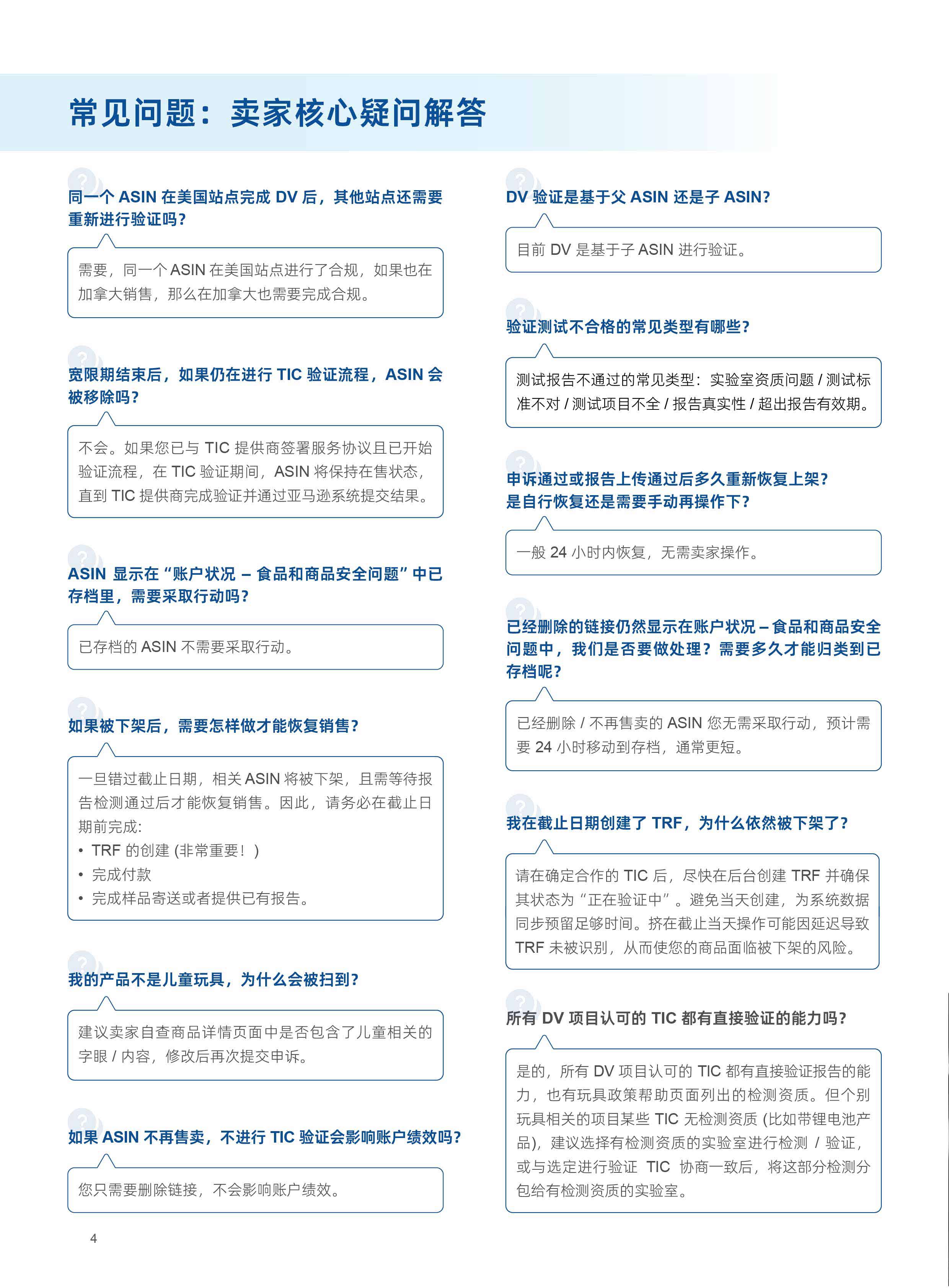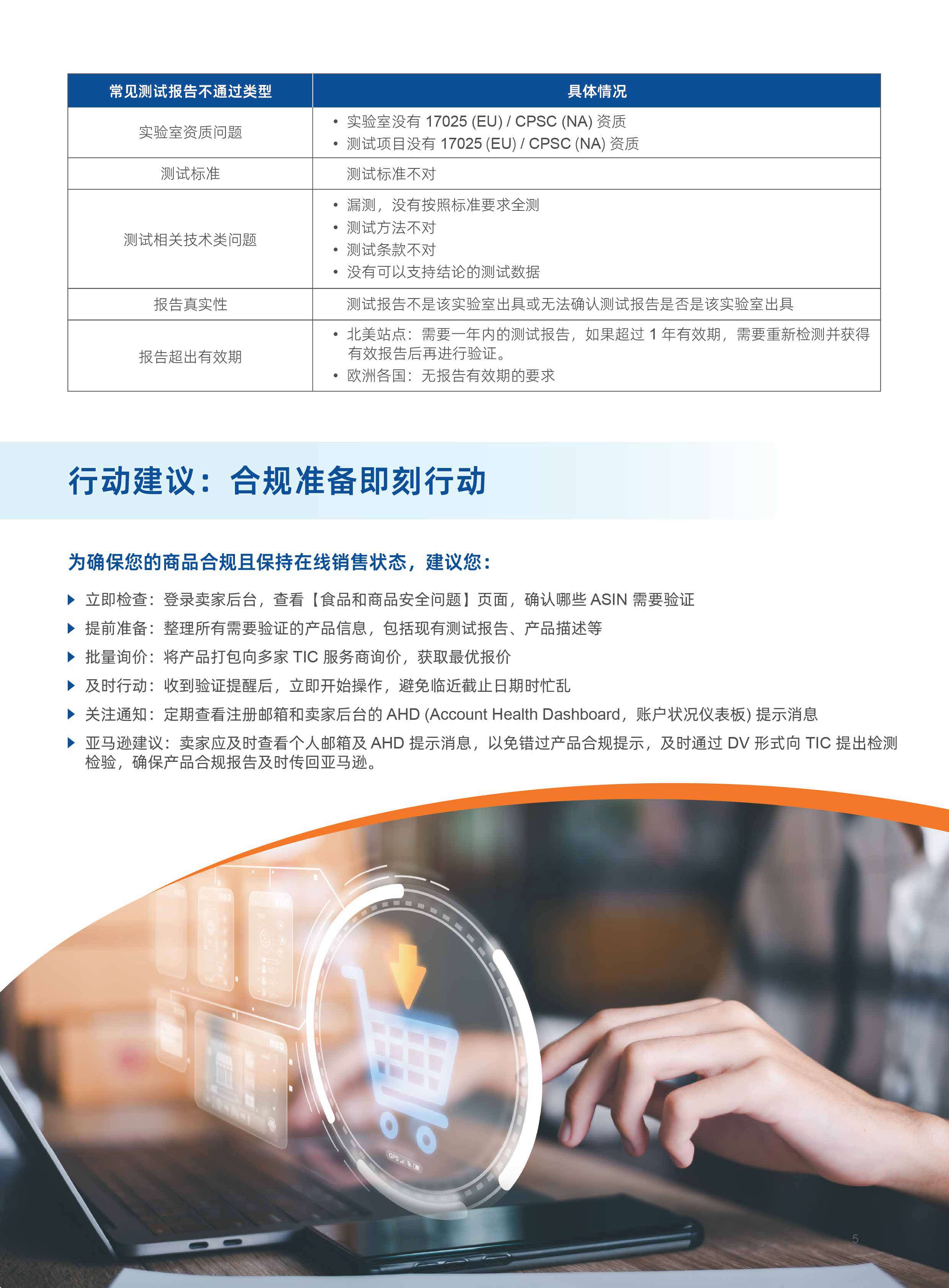 核心要求:卖家必须通过亚马逊认可的第三方检测、检验和认证 (Testing, lnspection and Certification,简称 TIC) 服务提供商进行年度合规验证。