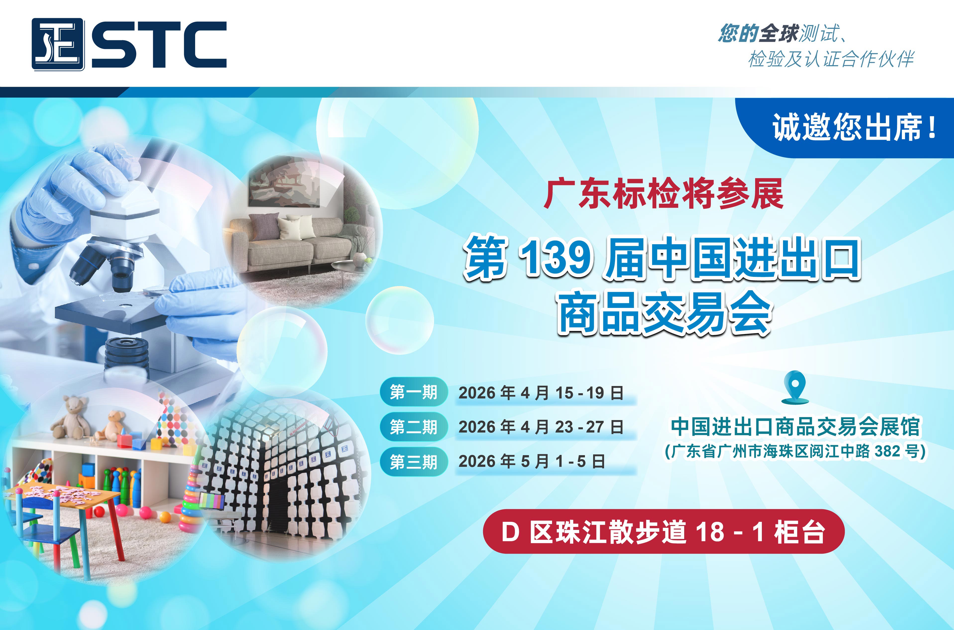 广东标检将参展第139届中国进出口商品交易会第一期:2026年4月15-19日第二期:2026年4月23-27日第三期:2026年5月1-5日展位号码:D区珠江散步道18-1柜台中国进出口商品交易会展馆(广东省广州市海珠区阅江中路382号)