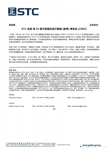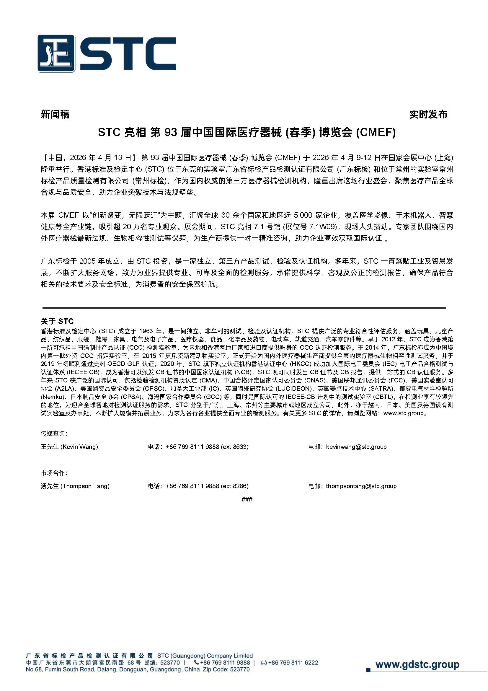 【中国,2026 年 4 月 13 日】第 93 届中国国际医疗器械 (春季) 博览会 (CMEF) 于 2026 年 4 月 9-12 日在国家会展中心 (上海) 隆重举行。香港标准及检定中心 (STC) 位于东莞的实验室广东省标检产品检测认证有限公司 (广东标检) 和位于常州的实验室常州标检产品质量检测有限公司 (常州标检),作为国内权威的第三方医疗器械检测机构,隆重出席这场行业盛会,聚焦医疗产品全球合规与品质安全,助力企业突破技术与法规壁垒。
