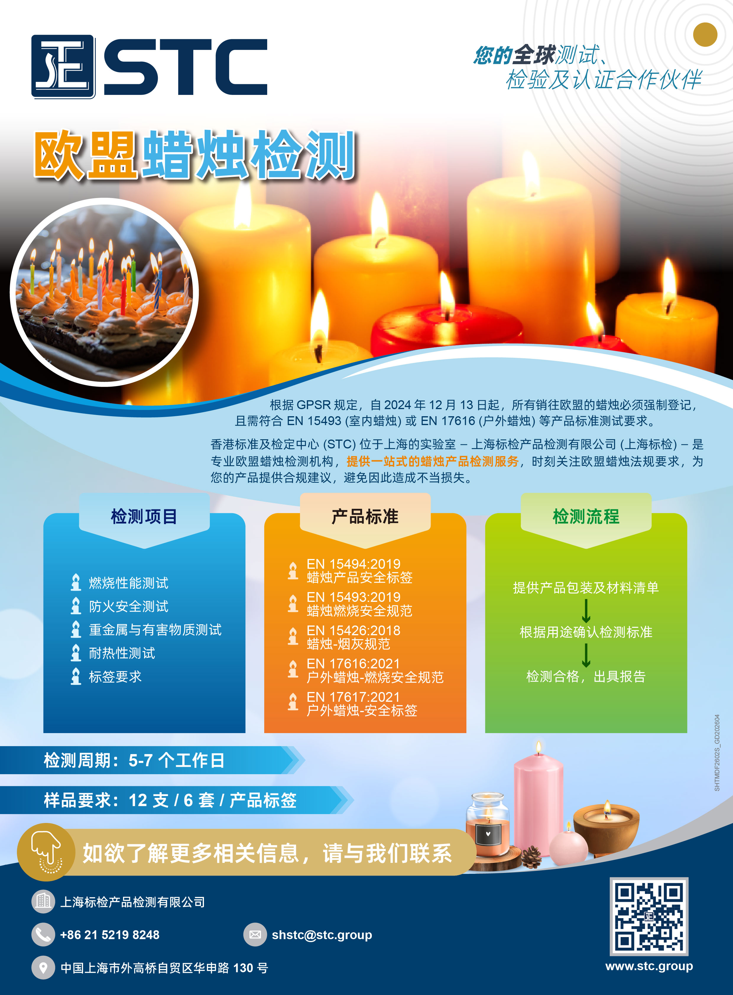 香港标准及检定中心 (STC) 位于上海的实验室 – 上海标检产品检测有限公司(上海标检) – 是专业欧盟蜡烛检测机构,提供一站式的蜡烛产品检测服务,时刻关注欧盟蜡烛法规要求,为您的产品提供合规建议,避免因此造成不当损失。