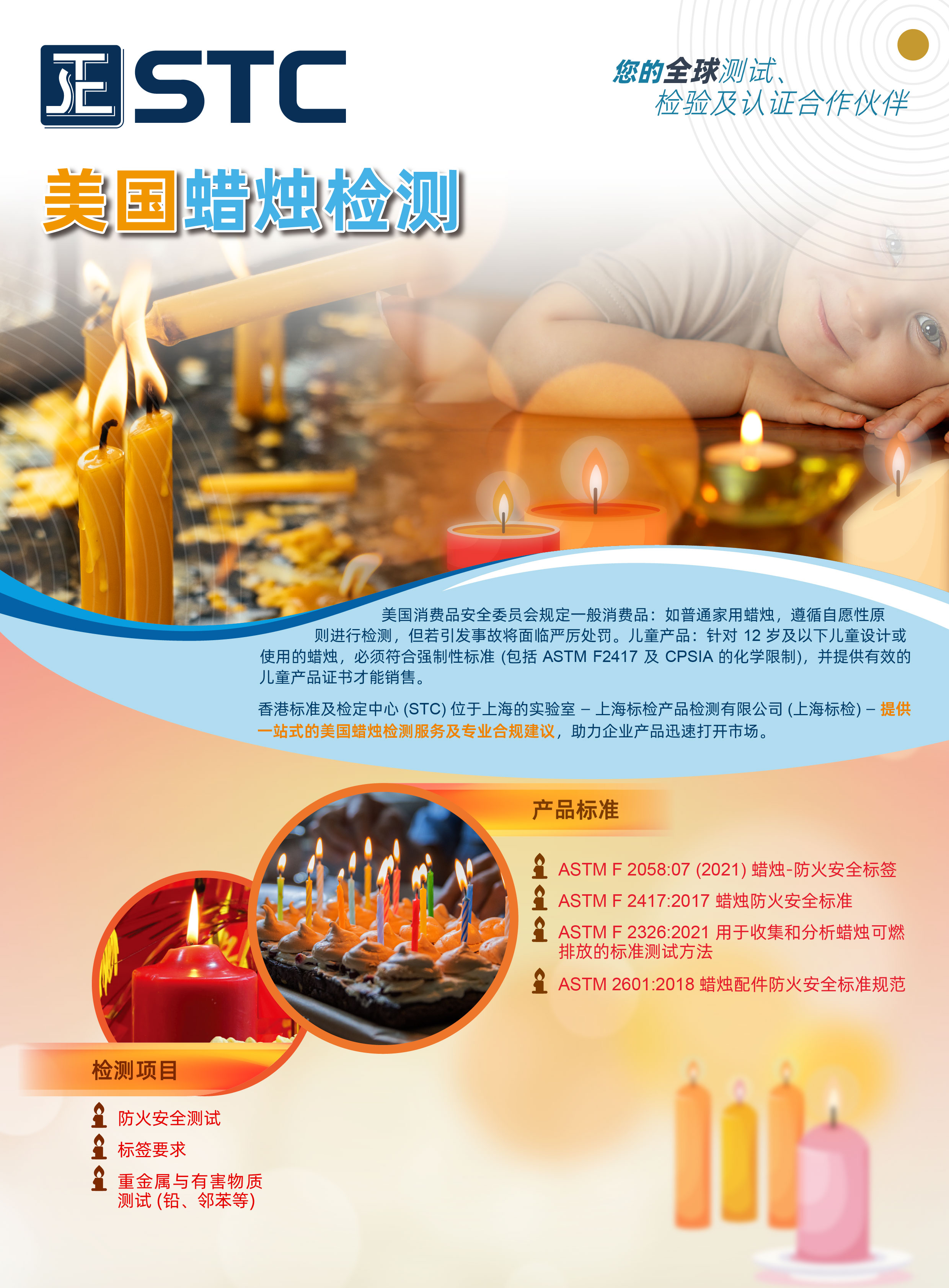 香港标准及检定中心 (STC) 位于上海的实验室 – 上海标检产品检测有限公司 (上海标检) – 提供一站式的美国蜡烛检测服务及专业合规建议,助力企业产品迅速打开市场。