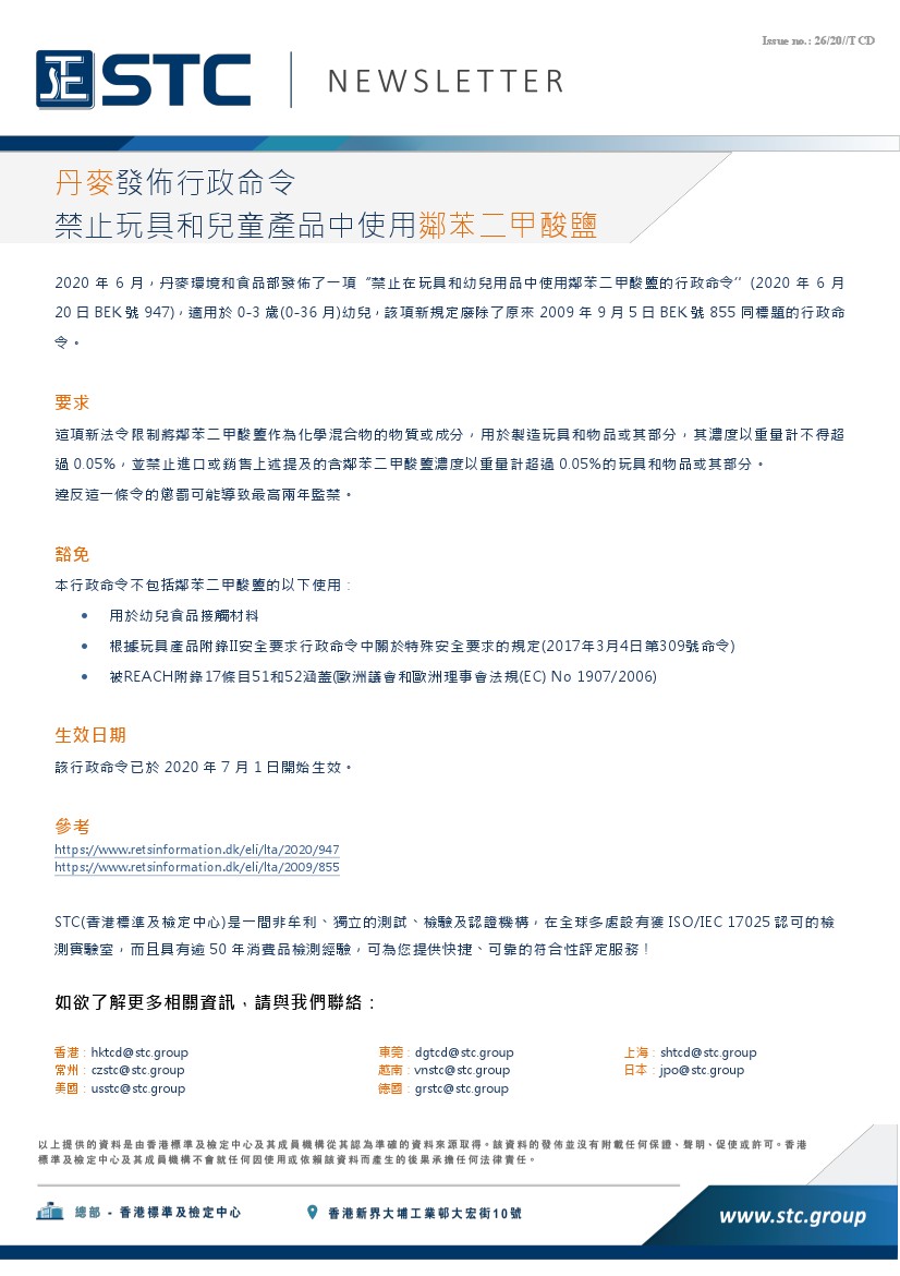 2020年6月,丹麥環境和食品部發佈了一項“禁止在玩具和幼兒用品中使用鄰苯二甲酸鹽的行政命令”(2020年6月20日BEK號947),適用於0-3歲(0-36月)幼兒,該項新規定廢除了原來2009年9月5日BEK號855同標題的行政命令。