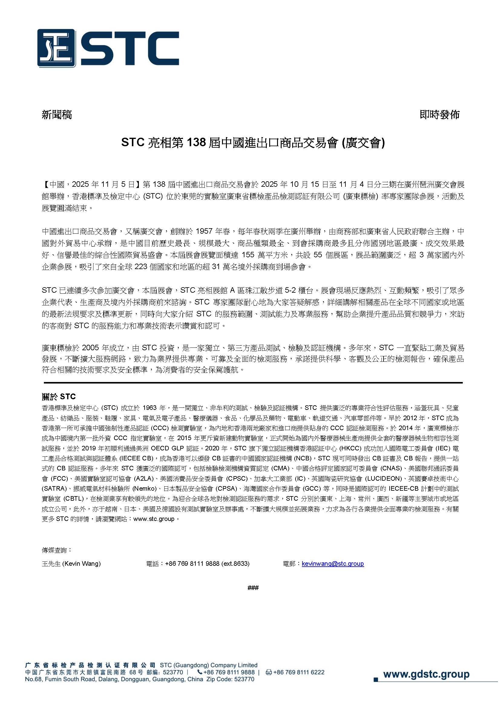 第 138 屆中國進出口商品交易會於 2025 年 10 月 15 日至 11 月 4 日分三期在廣州琶洲廣交會展館舉辦,香港標準及檢定中心 (STC) 位於東莞的實驗室廣東省標檢產品檢測認証有限公司 (廣東標檢) 率專家團隊參展,活動及展覽圓滿結束。