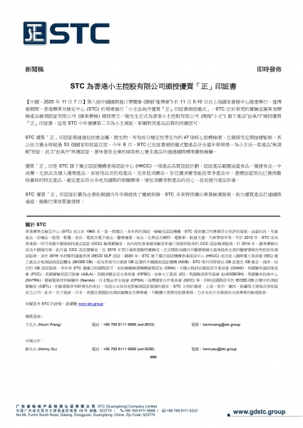 STC 優質「正」印認証計劃為企業拓展國內外市場提供了權威保障。STC 未來將持續以專業檢測服務,助力優質產品打通國際通道,推動行業高質量發展。