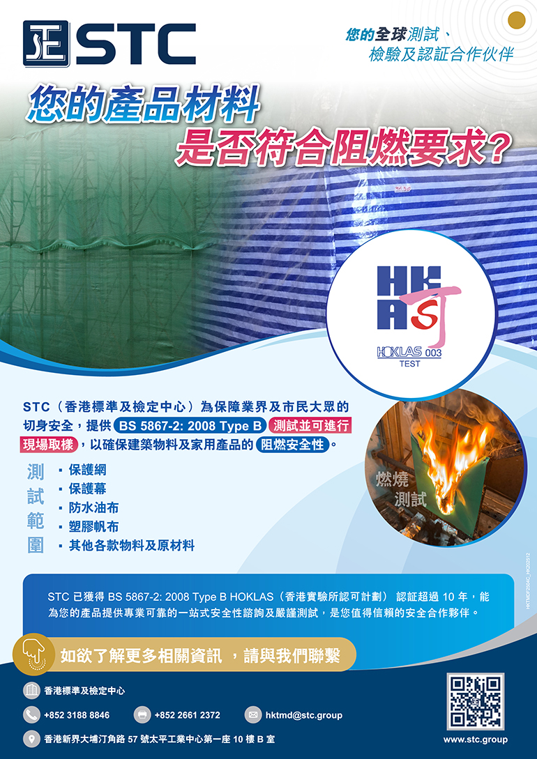 STC(香港標準及檢定中心)為保障業界及市民大眾的切身安全,提供 BS 5867-2: 2008 Type B 測試並可進行現場取樣,以確保建築物料及家用產品的 阻燃安全性。