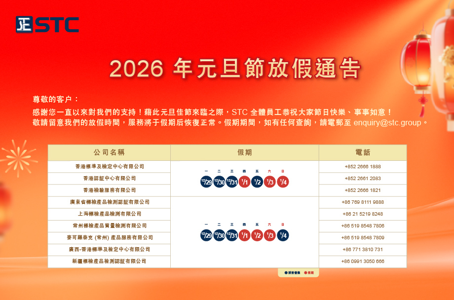 尊敬的客戶:感謝您一直以來對我們的支持!藉此元旦佳節來臨之際,STC 全體員工恭祝大家節日快樂、事事如意!敬請留意我們的放假時間,服務將於假期後恢復正常。假期期間,如有任何查詢,請電郵至 enquiry@stc.group。