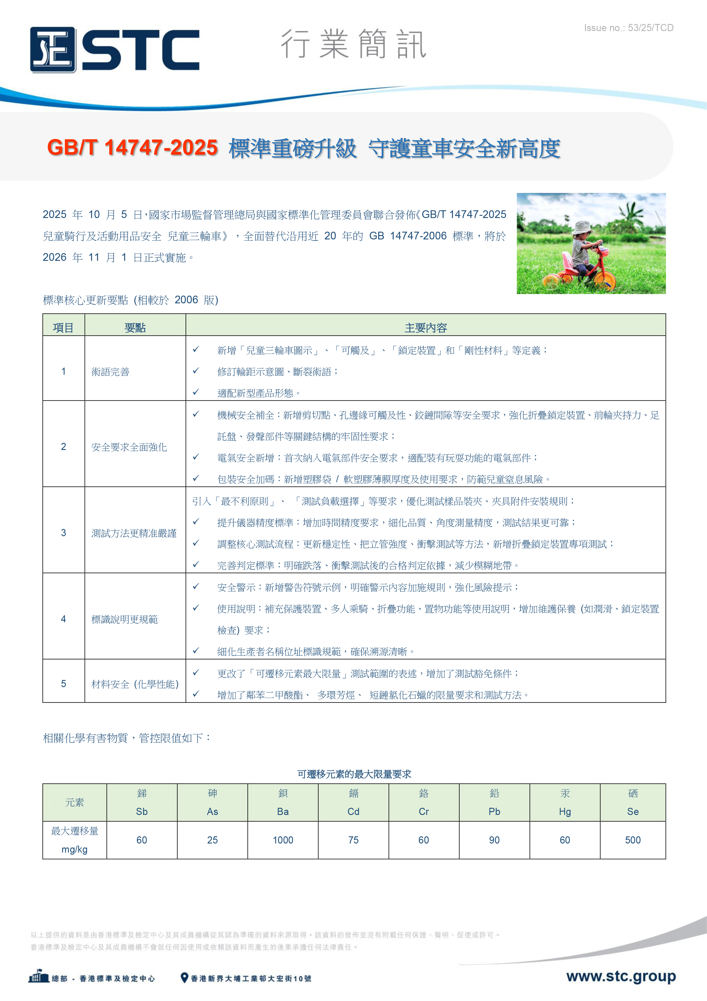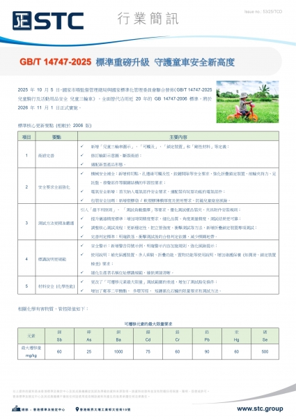 2025 年 10 月 5 日,國家市場監督管理總局與國家標準化管理委員會聯合發佈《GB/T 14747-2025 兒童騎行及活動用品安全兒童三輪車》,全面替代沿用近20 年的 GB 14747-2006 標準,將於 2026 年 11 月 1 日正式實施。