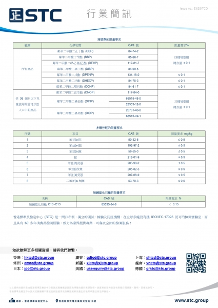 - 更改了「可遷移元素最大限量」測試範圍的表述,增加了測試豁免條件; - 增加了鄰苯二甲酸酯、多環芳烴、短鏈氯化石蠟的限量要求和測試方法。 |