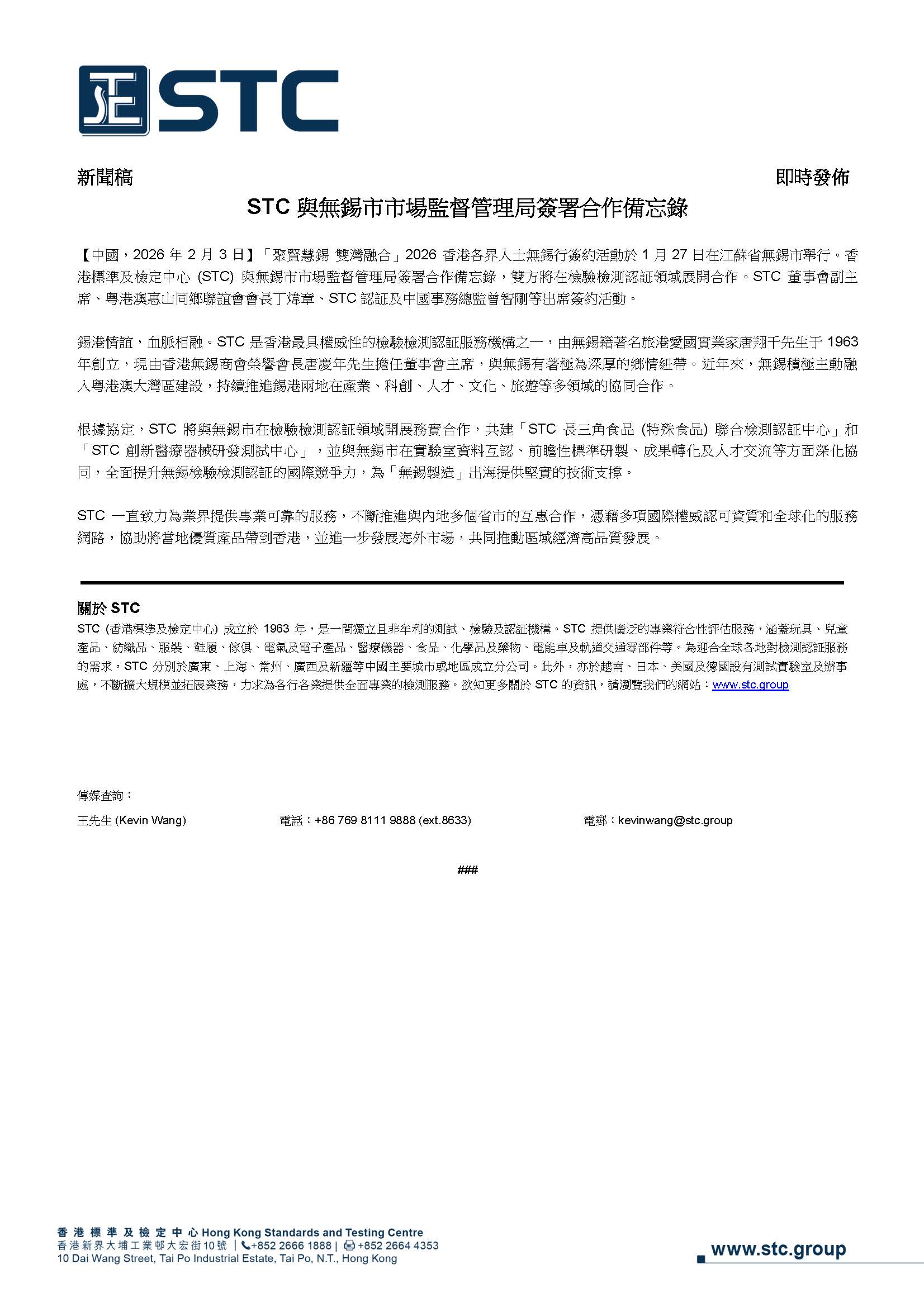 【中國,2026年2月3日】「聚賢慧錫雙灣融合」2026 香港各界人士無錫行簽約活動於 1 月 27 日在江蘇省無錫市舉行。香港標準及檢定中心 (STC) 與無錫市市場監督管理局簽署合作備忘錄,雙方將在檢驗檢測認証領域展開合作。STC 董事會副主席、粵港澳惠山同鄉聯誼會會長丁煒章、STC 認証及中國事務總監曾智剛等出席簽約活動。