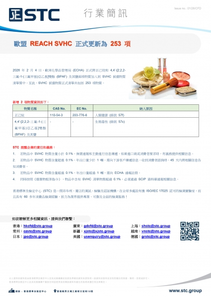 2026 年 2 月 4 日,歐洲化學品管理局 (ECHA) 正式將正己烷和 4,4’-[2,2,2-三氟-1-(三氟甲基)亞乙基]雙酚 (BPAF) 及其鹽兩項物質加入到 SVHC 候選物質清單質中。至此,SVHC 候選物質正式清單共包括 253 項物質。