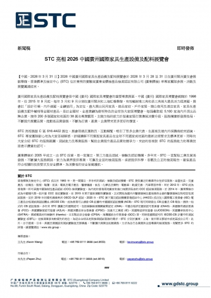 香港標準及檢定中心 (STC) 成立於 1963 年,是一間獨立、非牟利的測試、檢驗及認証機構。STC 提供廣泛的專業符合性評估服務,涵蓋玩具、兒童產品、紡織品、服裝、鞋履、家具、電氣及電子產品、醫療儀器、食品、化學品及藥物、電動車、軌道交通、汽車零部件等。早於 2012 年,STC 成為香港第一所可承擔中國強制性產品認証 (CCC) 檢測實驗室,為內地和香港兩地廠家和進口商提供貼身的 CCC 認証檢測服務。於 2014 年,廣東標檢亦成為中國境內第一批外資 CCC 指定實驗室,在 2015 年更斥資新建動物實驗室,正式開始為國內外醫療器械生產商提供全套的醫療器械生物相容性測試服務,並於 2019 年初順利通過美洲 OECD GLP 認証。2020 年,STC 旗下獨立認証機構香港認証中心 (HKCC) 成功加入國際電工委員會 (IEC) 電工產品合格測試與認証體系 (IECEE CB),成為香港可以頒發 CB 証書的中國國家認証機構 (NCB),STC 現可同時發出 CB 証書及 CB 報告,提供一站式的 CB 認証服務。多年來 STC 獲廣泛的國際認可,包括檢驗檢測機構資質認定 (CMA)、中國合格評定國家認可委員會 (CNAS)、美國聯邦通訊委員會 (FCC)、美國實驗室認可協會 (A2LA)、美國消費品安全委員會 (CPSC)、加拿大工業部 (IC)、英國陶瓷研究協會 (LUCIDEON)、英國賽卓技術中心 (SATRA)、挪威電氣材料檢驗所 (Nemko)、日本製品安全協會 (CPSA)、海灣國家合作委員會 (GCC) 等,同時是國際認可的 IECEE-CB 計劃中的測試實驗室 (CBTL),在檢測業享有較領先的地位。為迎合全球各地對檢測認証服務的需求,STC 分別於廣東、上海、常州等主要城市或地區成立公司,此外,亦于越南、日本、美國及德國設有測試實驗室及辦事處,不斷擴大規模並拓展業務,力求為各行各業提供全面專業的檢測服務。有關更多 STC 的詳情,請瀏覽網站:www.stc.group。