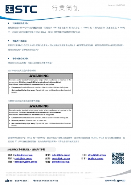 2026 年 3 月 12 日,美國 CPSC 關於吸水珠玩具專項法規 16 CFR 1250.4 WATER BEAD (吸水珠) 已正式開始生效。該法規在 ASTM F963-23 基礎上新增更嚴苛的安全要求,旨在解決吸水珠玩具誤食、插入耳鼻、吸入窒息及丙烯醯胺毒性等致命風險。所有面向 14 歲以下兒童的吸水珠玩具及含水珠玩具,均需通過合規測試方可進入美國市場。作為權威第三方測試實驗室,STC 緊跟法規更新節奏,率先開發 16 CFR 1250.4 WATER BEAD 專項測試服務,憑借專業技術團隊、標準測試設備及精准檢測能力,為企業提供全流程合規測試支援,助力規避召回、罰款風險,順暢打通美國出口通道。