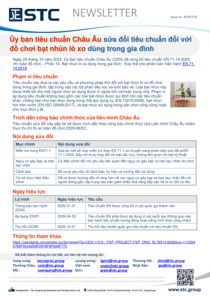 Ngày 29 tháng 10 năm 2025, Ủy ban tiêu chuẩn Châu Âu (CEN) đã công bố tiêu chuẩn EN 71-14:2025, ‘An toàn đồ chơi – Phần 14: Bạt nhún lò xo dùng trong gia đình’, thay thế cho phiên bản hiện hànhEN 71-14:2018.