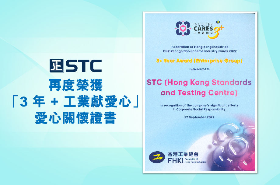 【Hong Kong, 27 September 2022】Organized by the Federation of Hong Kong Industries (FHKI), the grand award ceremony of the Industry Cares Recognition Scheme 2022, officiated by Mr. Chris Sun, JP, the Secretary for Labour and Welfare, took place at Hotel ICON in East Tsim Sha Tsui tonight. Awarded the “Caring Certificate” for three consecutive years, STC (Hong Kong Standards and Testing Centre) is, once again, granted the “3+ Year Caring Certificate” this year for its four-year contribution to the society.