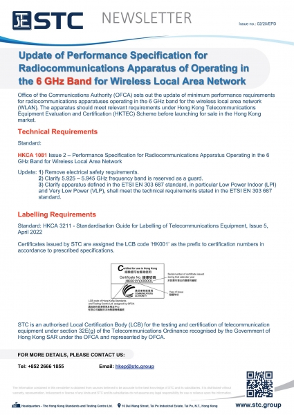 Office of the Communications Authority (OFCA) sets out the update of minimum performance requirements for radiocommunications apparatuses operating in the 6 GHz band for the wireless local area network (WLAN). The apparatus should meet relevant requirements under Hong Kong Telecommunications Equipment Evaluation and Certification (HKTEC) Scheme before launching for sale in the Hong Kong market.