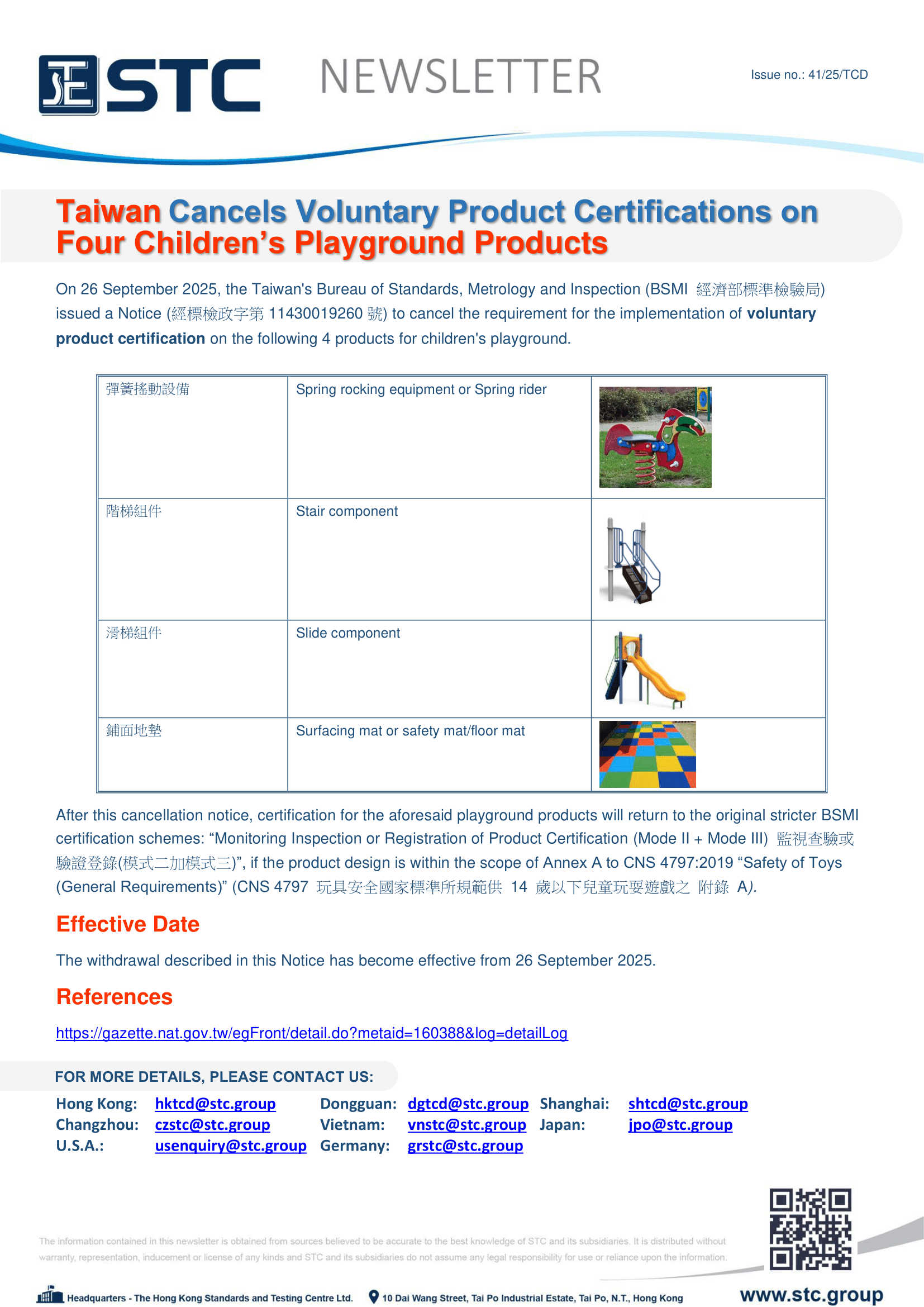 On 26 September 2025, the Taiwan's Bureau of Standards, Metrology and Inspection (BSMI 經濟部標準檢驗局) issued a Notice (經標檢政字第11430019260號) to cancel the requirement for the implementation of voluntary product certification on the following 4 products for children's playground.
