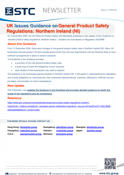 On 4 November 2025, the UK Office for Product Safety and Standards published a new update of their Guidance on “General product safety regulations: Northern Ireland – Guidance for businesses on Regulation 2023/988.”