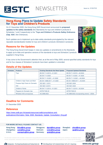 On 01 December 2025, the Hong Kong SAR Government announced its proposed updates to the safety standards (the Standards) for toys and children’s products in Schedules 1 and 2 respectively to the “Toys and Children’s Products Safety Ordinance (Cap. 424)” (the Ordinance).