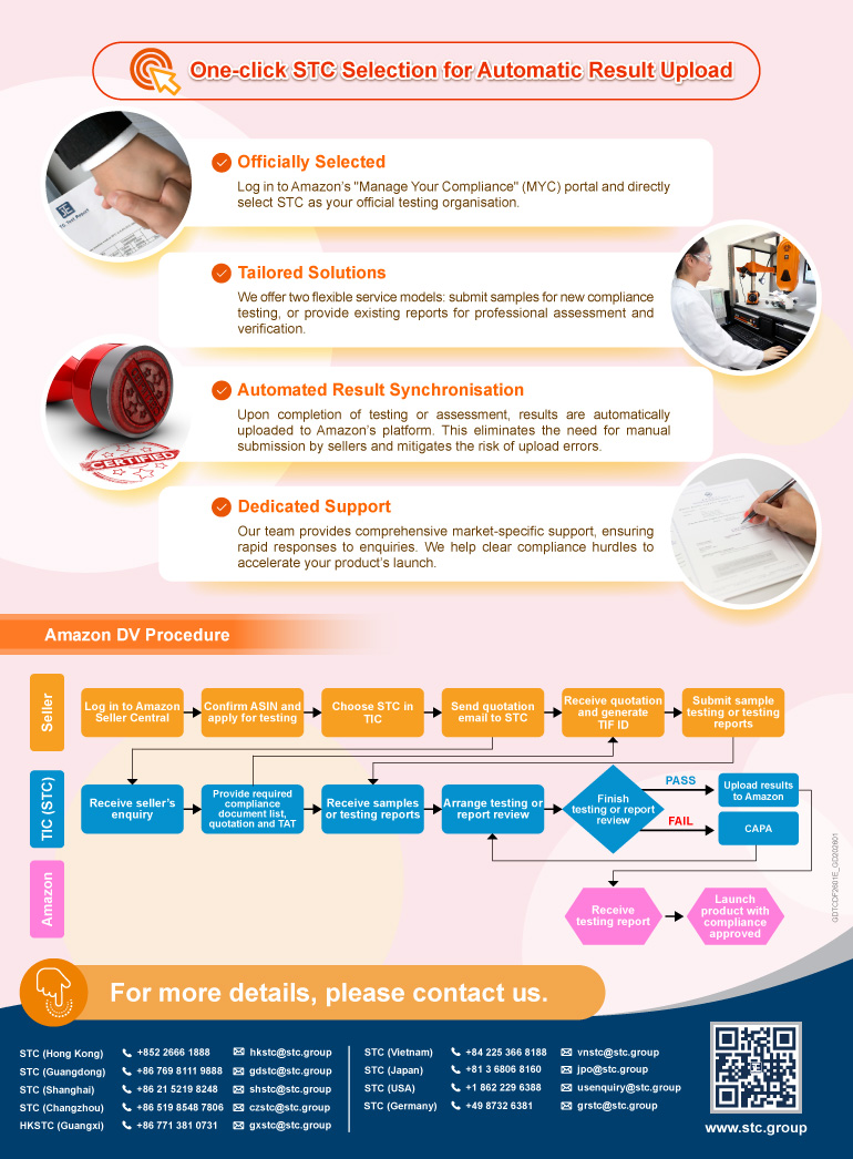 Your trusted compliance partner is here! With leading technical expertise and rigorous management processes, The Hong Kong Standards and Testing Centre Limited (STC) is officially recognised by Amazon as a designated TIC DV laboratory. We provide one-stop compliance verification services to ensure your products launch smoothly.