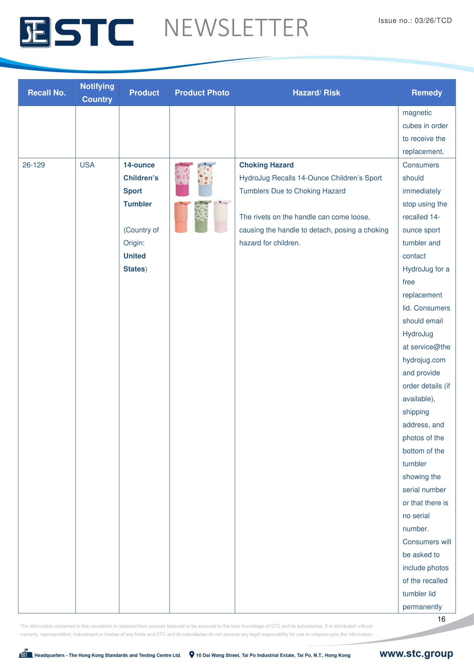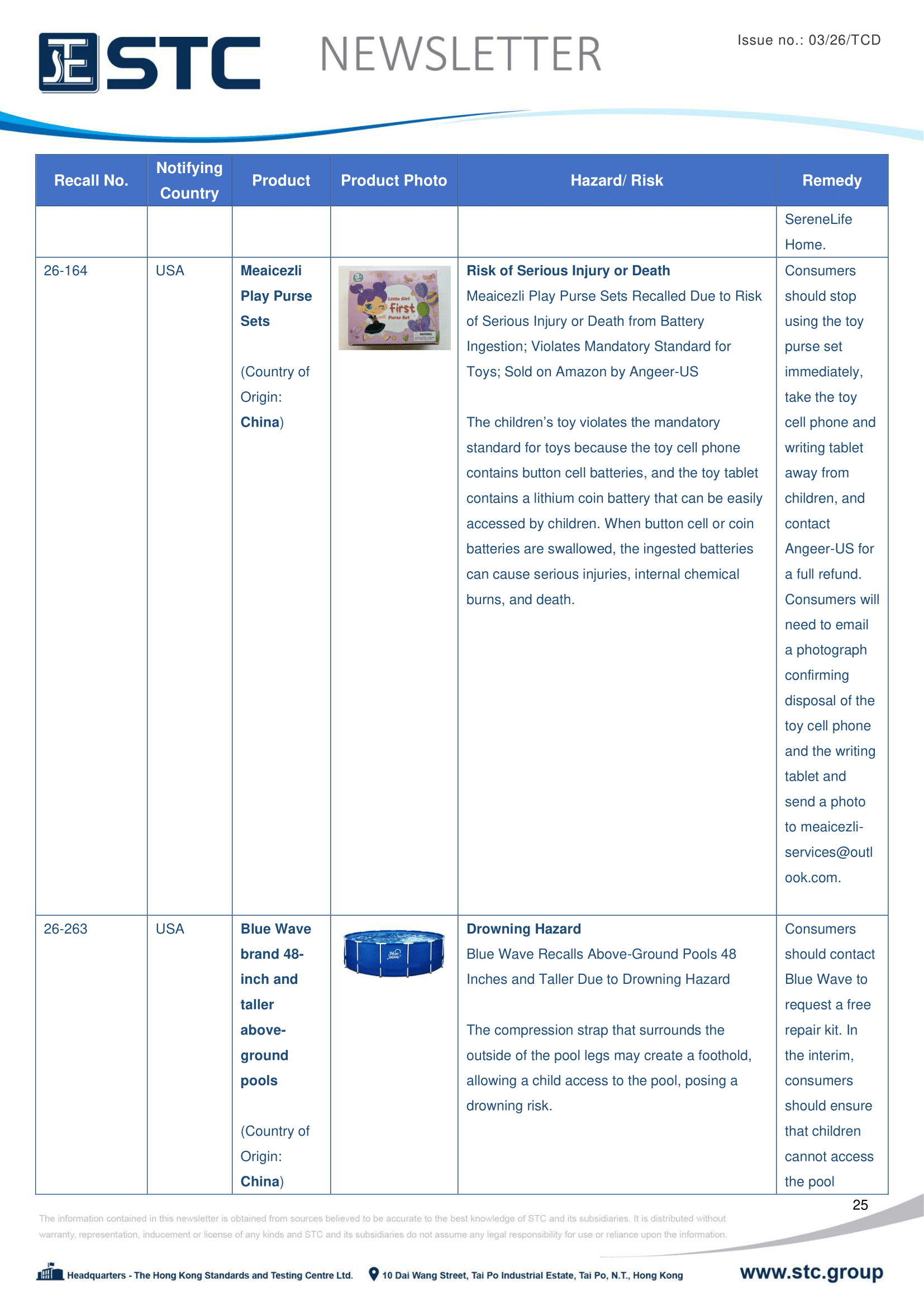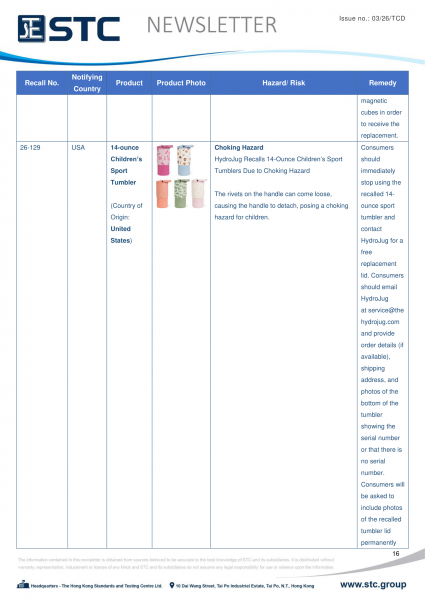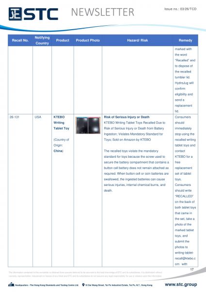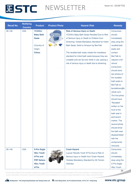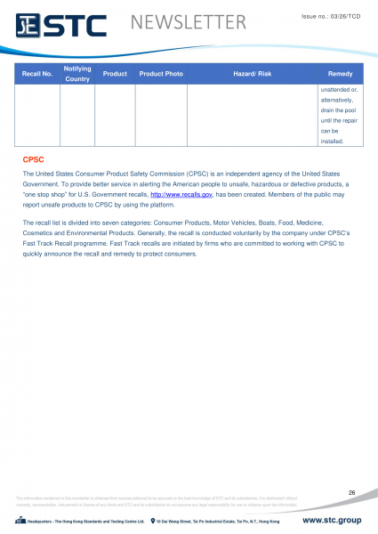The recall list is divided into seven categories: Consumer Products, Motor Vehicles, Boats, Food, Medicine, Cosmetics and Environmental Products. Generally, the recall is conducted voluntarily by the company under CPSC’s Fast Track Recall programme. Fast Track recalls are initiated by firms who are committed to working with CPSC to quickly announce the recall and remedy to protect consumers.